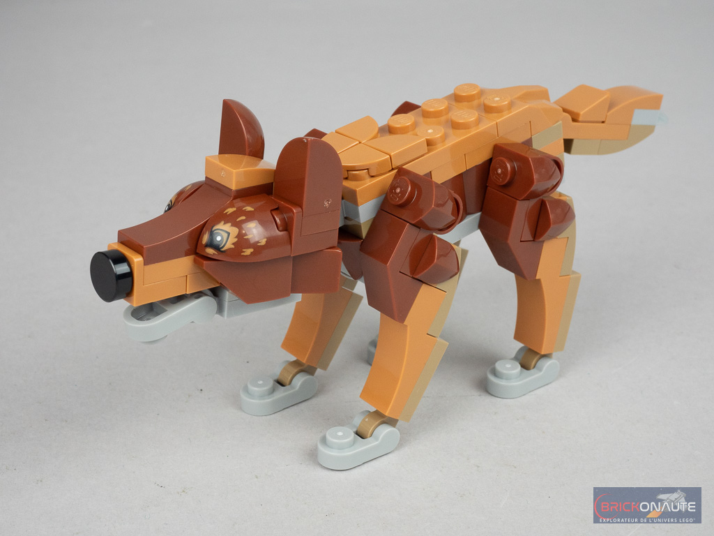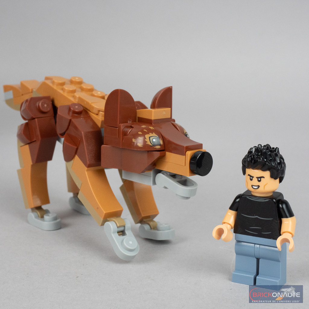 La construction de la maison se termine par deux morceaux de toit plats, qui sont maintenus en place par des petites round plates situées en dessous. Le dernier sachet de pièces est dédié à l’assemblage de la forme de loup de Jacob, avec des pattes articulées sur des pins Technic et la tête sur un ball joint. La réalisation est simple, mais le résultat est très réussi à mon goût.