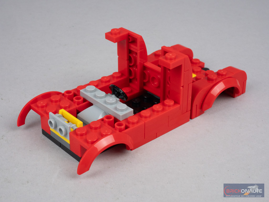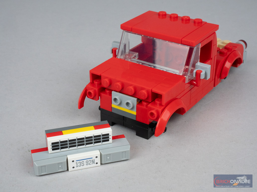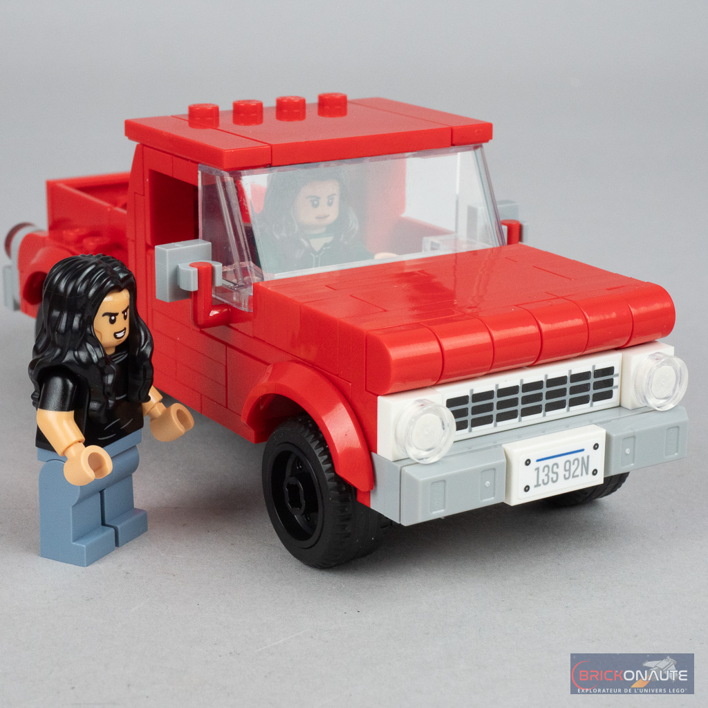 La construction commence par le pickup de Bella, plutôt classique dans sa conception avec une structure à base d’éléments SNOT, une benne à l’arrière formée avec quelques panels, et un petit poste de conduite accessible en retirant une partie du toit. Le véhicule n’a rien de vraiment « spécial » qui l’identifierait précisément comme le pickup du film, et aurait pu tout à fait se retrouver dans une petite boîte à 10 € de la gamme LEGO City.
