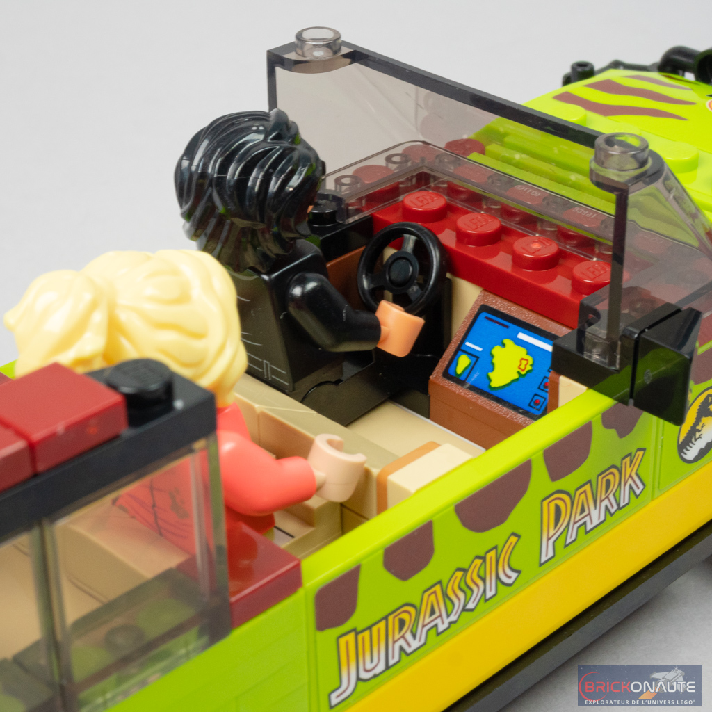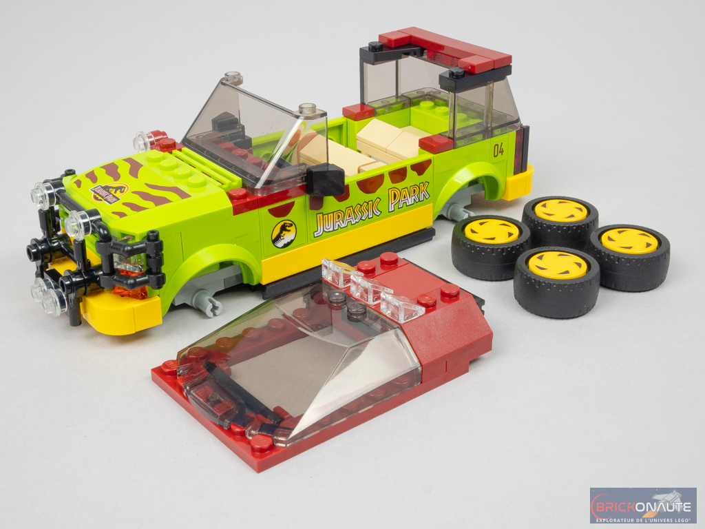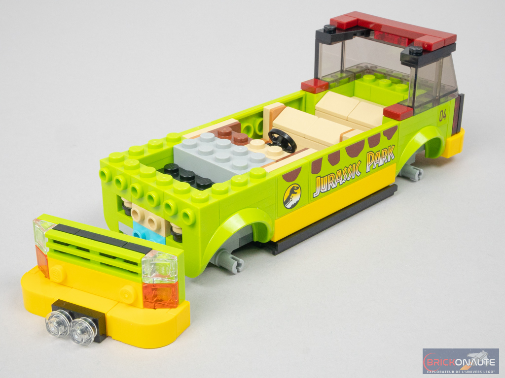 LEGO a choisi de nous proposer la Ford Explorer, la voiture qui emmène les visiteurs faire le tour de Jurassic Park en suivant un rail. Pourquoi pas, après tout c’est dans cette voiture qu’Ellie Sattler et Ian Malcolm arrivent sur le site. Cela aurait également pu être la Jeep du ranger qui s’occupe de la bête. La voiture fait 6 tenons de large, soit la même largeur que les « grosses » voitures de la gamme LEGO City. Le niveau de finition est tout à fait comparable avec des raccourcis esthétiques inhérents à l’échelle retenue.
