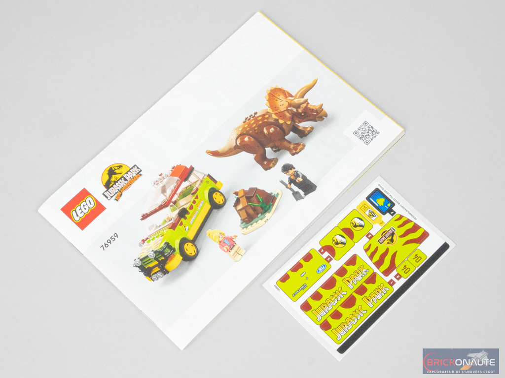 Hormis le dinosaure et les minifigs sur lesquelles je reviendrai juste en dessous, on notera dans l’inventaire les quelques éléments bright yellowish green et un pare-brise plat, sans tampographie, habituellement vu pour les supercars de la gamme LEGO Speed Champions. On remarquera surtout le prix extrêmement élevé de l’ensemble, à 52,99 € pour seulement 281 pièces ! Ce qui en fait le plus cher des sets LEGO Jurassic Park sortis cette année, si on exclut le petit set 4+.