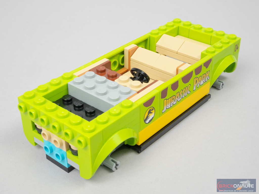 Les deux premiers sachets de pièces sont dédiés à l’assemblage de la Ford Explorer. Je ne vais pas m’étendre des heures sur le processus d’assemblage, c’est assez classique : un châssis brick-built (la voiture est un peu longue), des éléments SNOT pour la fixation de la carrosserie, deux pare-brises et un toit. On notera malgré tout quelques originalités dans la réalisation du pare-chocs et du pare-buffle, avec l’utilisation de skeleton arms, ça fonctionne bien. Le troisième pare-brise est fixé sur le toit et sa forme correspond plutôt bien à celle du véhicule du film. L’intérieur est aménagé avec deux rangées de sièges et une petite plage arrière – il sera malgré tout difficile de placer deux minifigs côte à côte.