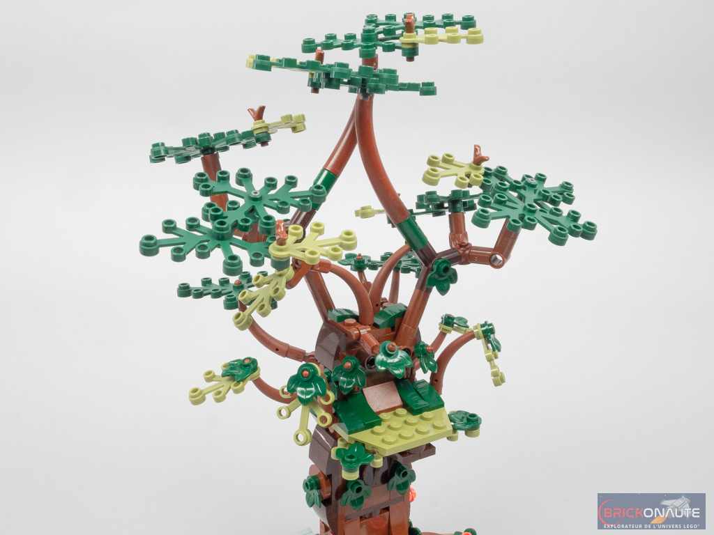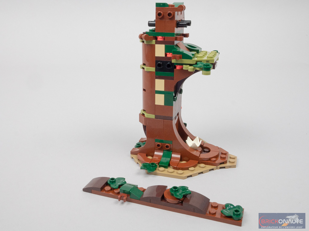 L’arbre est basé sur une grande plate octogonale de 10×10 tenons. On ajoute quelques racines au sol, puis on attaque la construction du tronc à grand renfort de pièces cylindriques, d’éléments SNOT pour ajouter le feuillage, et de demi-arches pour la plateforme. En partie supérieure, des pins Technic serviront à attacher les plus grandes branches. Les côtés du tronc sont habillés avec deux grands sous-assemblages qui masquent la structure. En bas, on remarquera la coquille d’oeuf.