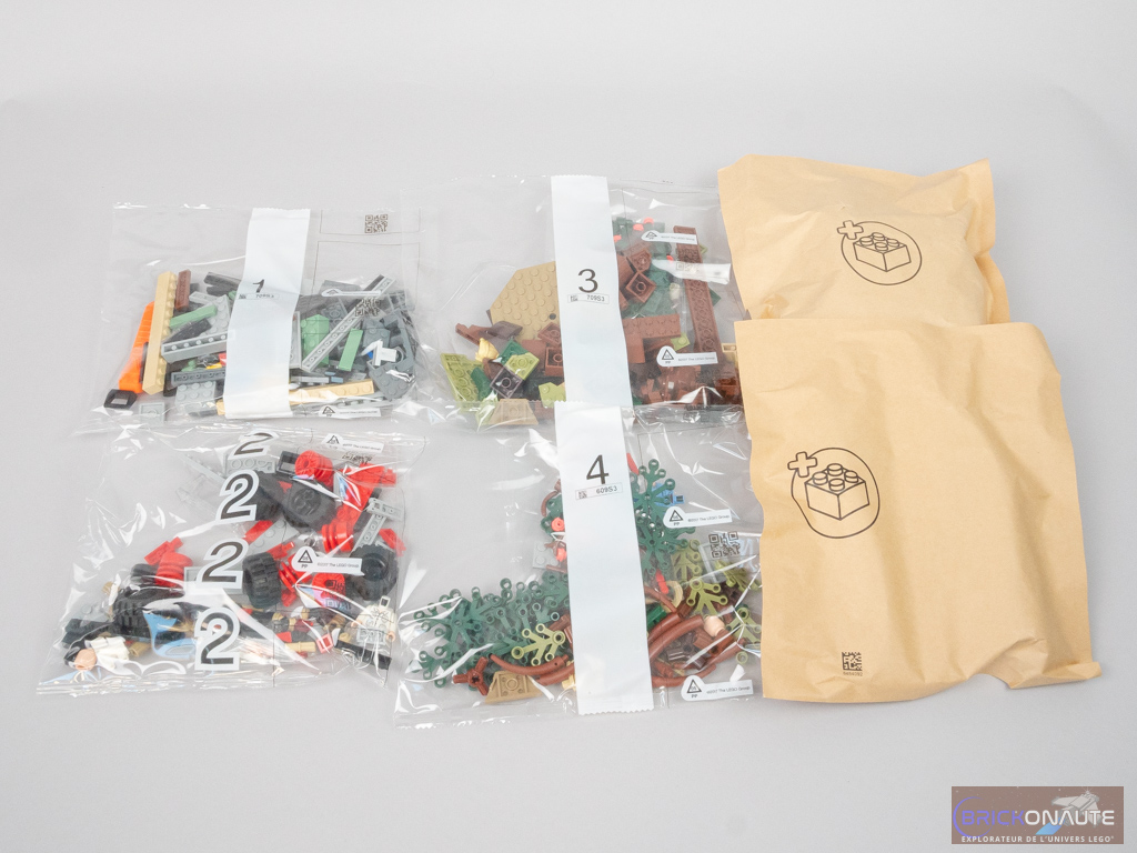 À l’intérieur de la boîte, on trouve 4 sachets en plastique numérotés de 1 à 4, et 2 sachets en papier qui contiennent de quoi construire le brachiosaure. La notice d’instructions compte 80 pages, et LEGO fournit également une (petite) planche de 6 autocollants.