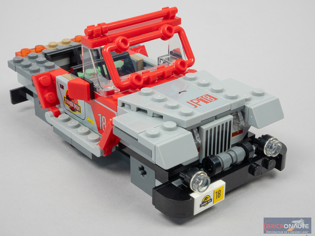 Ce set est enfin l’occasion d’obtenir une vraie Jeep – les sets précédents se contentant de suggérer le véhicule de référence. Le véhicule est reconnaissable entre 1000, et le schéma de couleurs est cohérent avec la voiture de référence. L’intérieur est aménagé de manière à pouvoir y installer 3 minifigs (2 à l’avant et 1 à l’arrière) mais pour ce faire, le designer a dû élargir la voiture : le châssis mesure 8 tenons de large, soit 2 de plus par rapport à la Ford Explorer du set 76959 Triceratops Research, c’est dommage pour la cohérence. Je regrette une seule chose sur cette Jeep Wrangler : les roues dépassent du châssis.