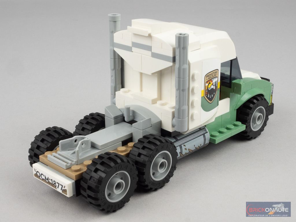 Comme toujours dans ces boîtes LEGO Jurassic World contenant un gros dinosaure, le prix crève le plafond avec un tarif de 89,99 € pour 588 pièces. Hormis les minifigs et le dino dont je vous parle juste en dessous, on notera quelques éléments intéressants dont un nouveau moule pour l’attache de la remorque côté tracteur, une jolie sélection de pièces sand green (petits garde-boue avec des phares, brackets et beams Technic) ou encore un pare-brise en trans black.