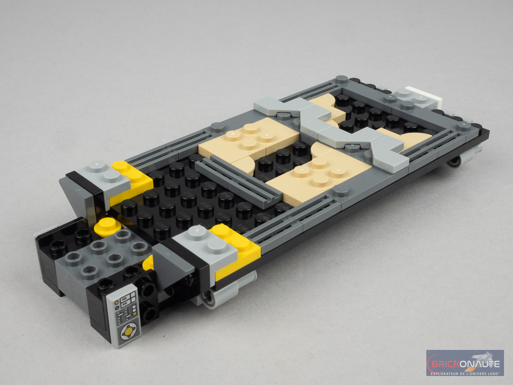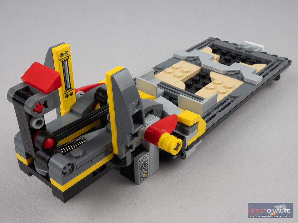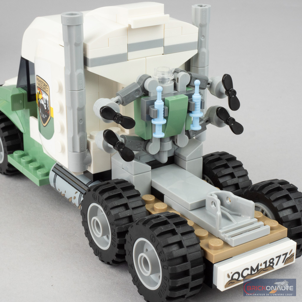 Notez également que la remorque dispose de deux béquilles à l’avant, et qu’un petit emplacement est prévu pour fixer le drone derrière la cabine du tracteur. La rampe arrière est déployable et on pourra par exemple garer le quad dans la remorque. La cabine du camion peut accueillir 2 minifigs, et une couchette permet d’y allonger une troisième. De la même manière, le quad est conçu pour pouvoir embarquer deux passagers.