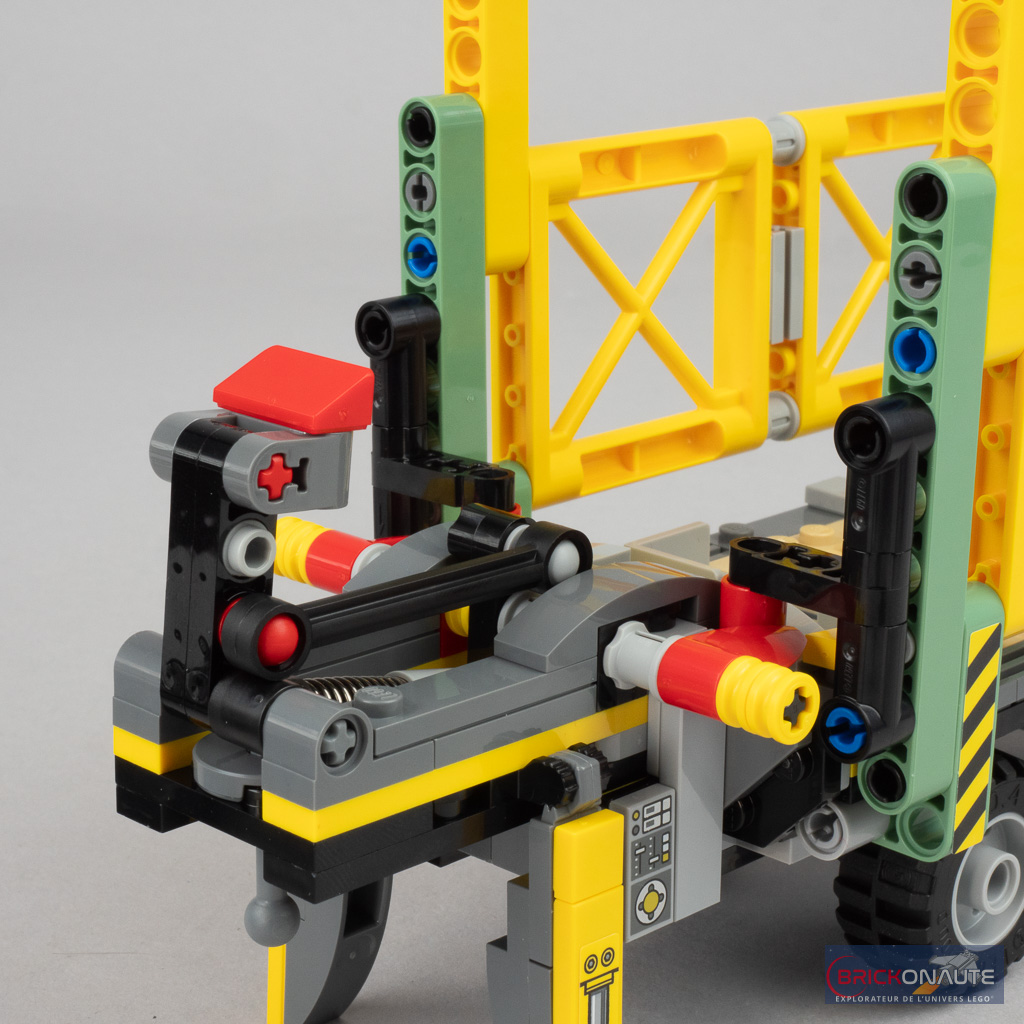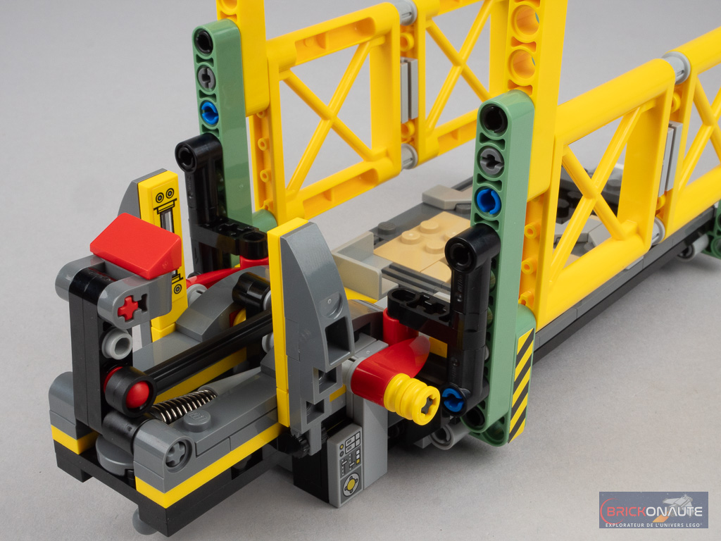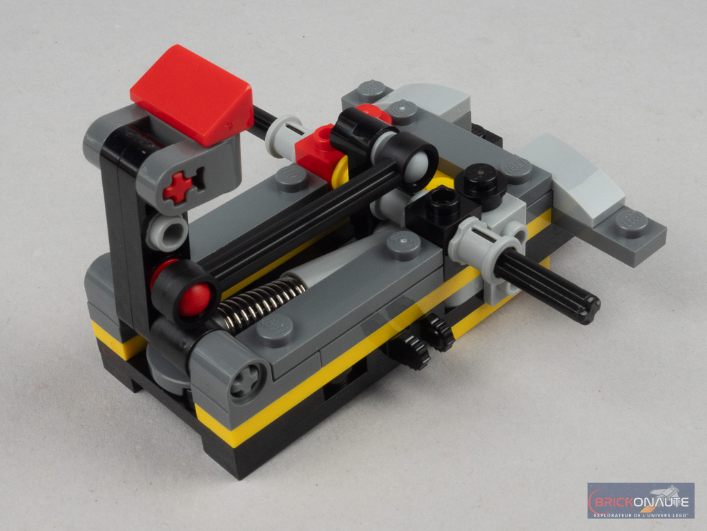L’étape qui suit est sans doute la plus intéressante du processus de construction : on s’occupe d’un sous-assemblage à base d’éléments Technic qui servira de mécanisme pour ouvrir les parois de la remorque. Celui-ci est intelligemment conçu avec un amortisseur à ressort qui vient se comprimer en poussant la partie rouge, pour faire tourner un axe avec deux dents aux extrémités.
