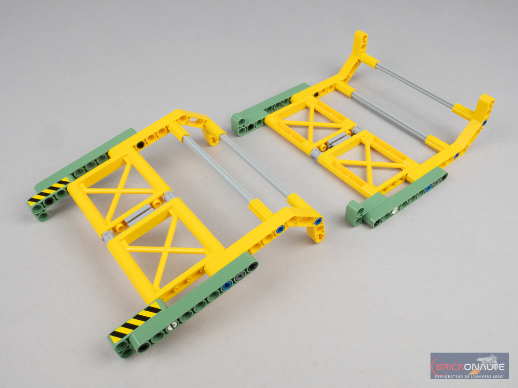 Nous assemblons ensuite les deux parois latérales de la remorque, identiques. Elles sont essentiellement constituées d’éléments Technic, et d’un petit sous-ensemble qui vient se fixer dans les dents rouges pour bloquer la paroi en position fermée. On termine avec la rampe d’accès arrière fixée sur des clips, les deux essieux et les 4 roues.