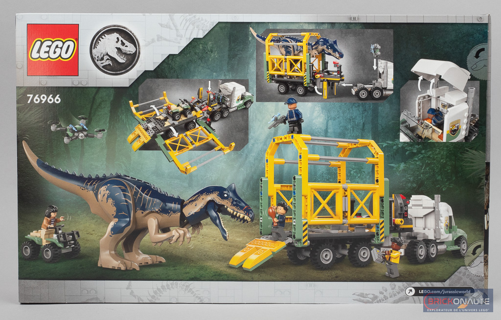 Les choses semblent bien mal embarquées sur la face avant de la boîte : l’allosaure vient de se libérer de sa cage de transport et semble prêt à dévorer tout ce qui bouge. Au dos, on trouve une seconde vue du camion, depuis l’arrière, et plusieurs vignettes insistant sur certains détails et fonctionnalités.