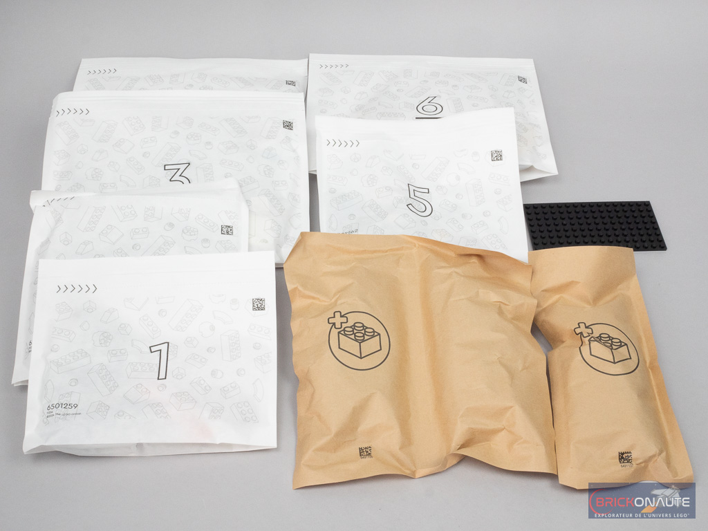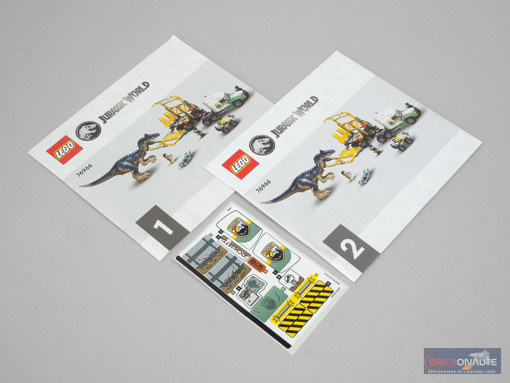 À l’intérieur, on trouve 6 sachets de pièces en papier numérotés, 2 autres de couleur marron sans numéro contenant les éléments du dinosaure, et une plate noire en vrac pour la remorque. On trouve également 2 notices d’instructions (pour le buggy, le drone et le tracteur dans la première, et pour la remorque dans la seconde) et une planche de 15 autocollants.