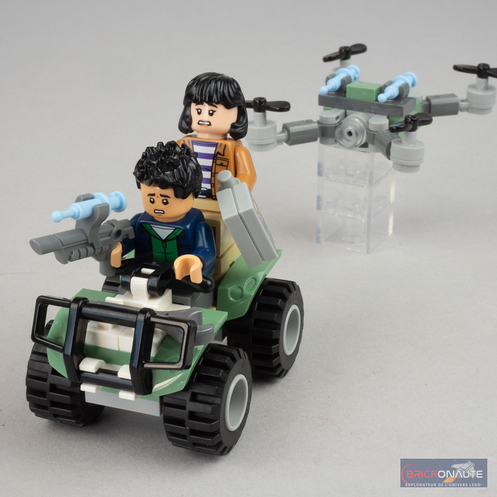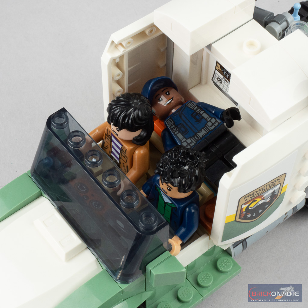 Allez, j’arrête avec les points positifs – et c’est déjà très bien. Mon regret principal dans cette boîte reste le dinosaure qui aurait mérité plus d’égards tant il fait grimper le prix. Il réutilise beaucoup d’éléments déjà vus chez LEGO, et seule la tête est un nouvel élément mais, si sa tampographie est fine et propre, la couleur n’est malheureusement pas raccord avec le corps et les griffes auraient mérité d’être colorées. Du côté des minfigs, c’est simple mais bien exécuté avec 3 personnages pour le moment exclusifs à ce set et issus de la série animée Jurassic World : la théorie du chaos diffusée sur Netflix.