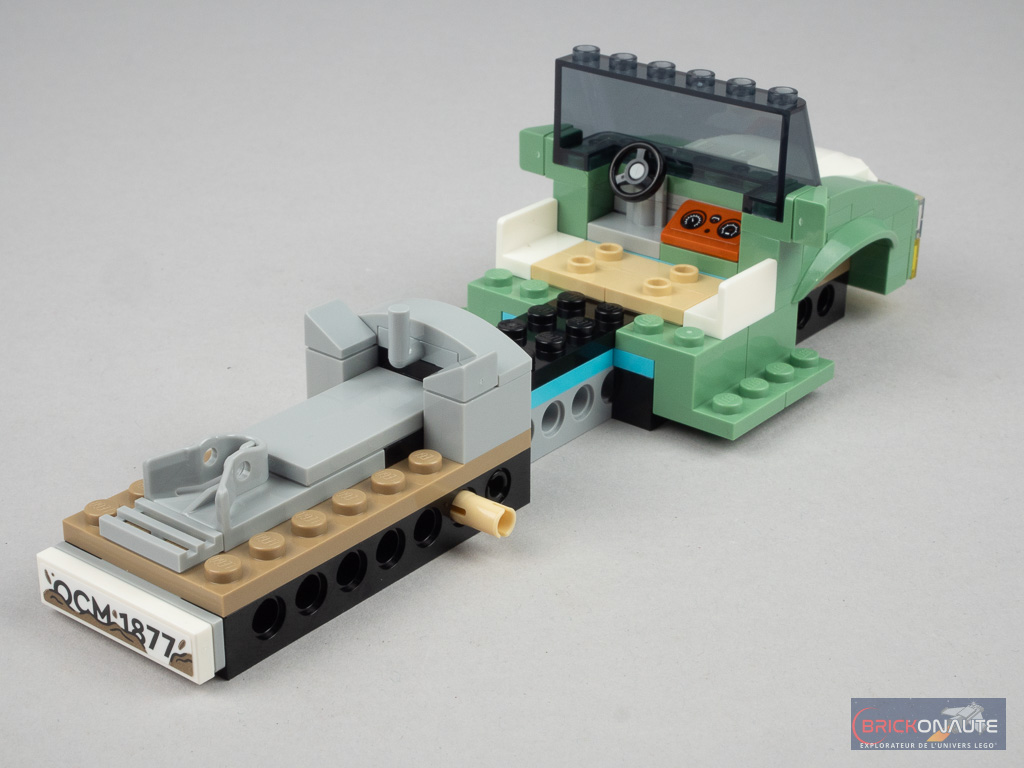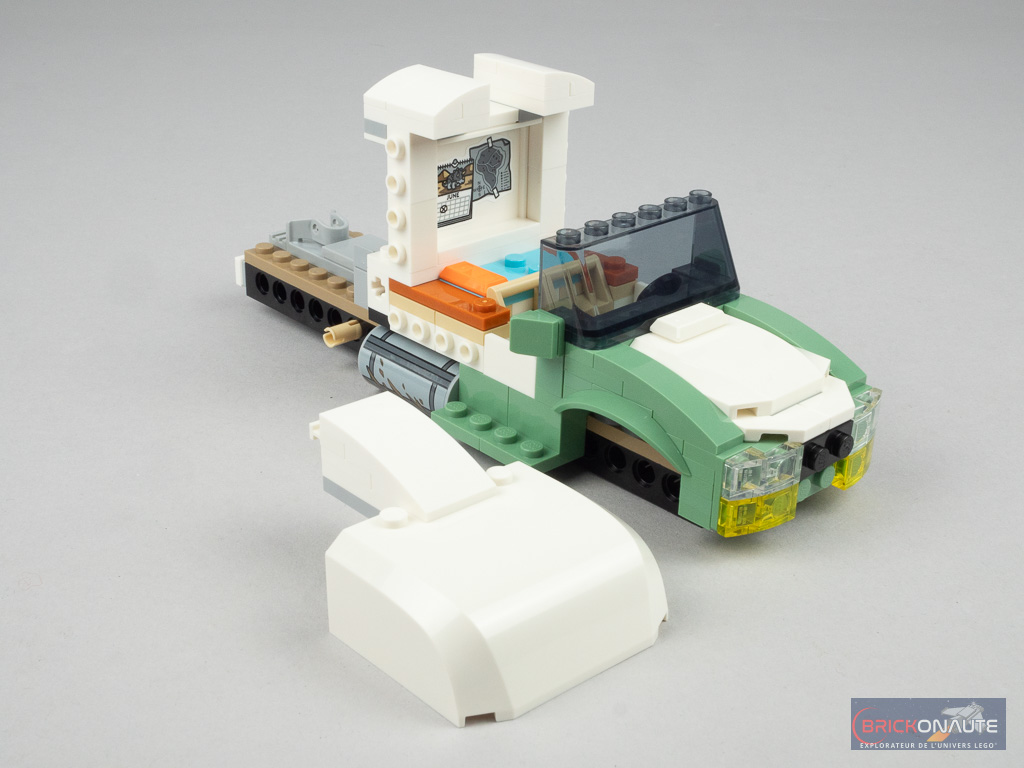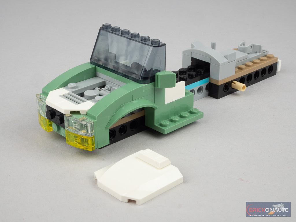 On s’attaque ensuite à l’assemblage du tracteur, sur un châssis constitué d’éléments Technic. On ajoute la nouvelle attache à l’arrière pour la remorque, puis on passe sur l’avant avec la construction d’un moteur factice. On habille tout ça de pièces sand green et d’éléments translucides pour les optiques.