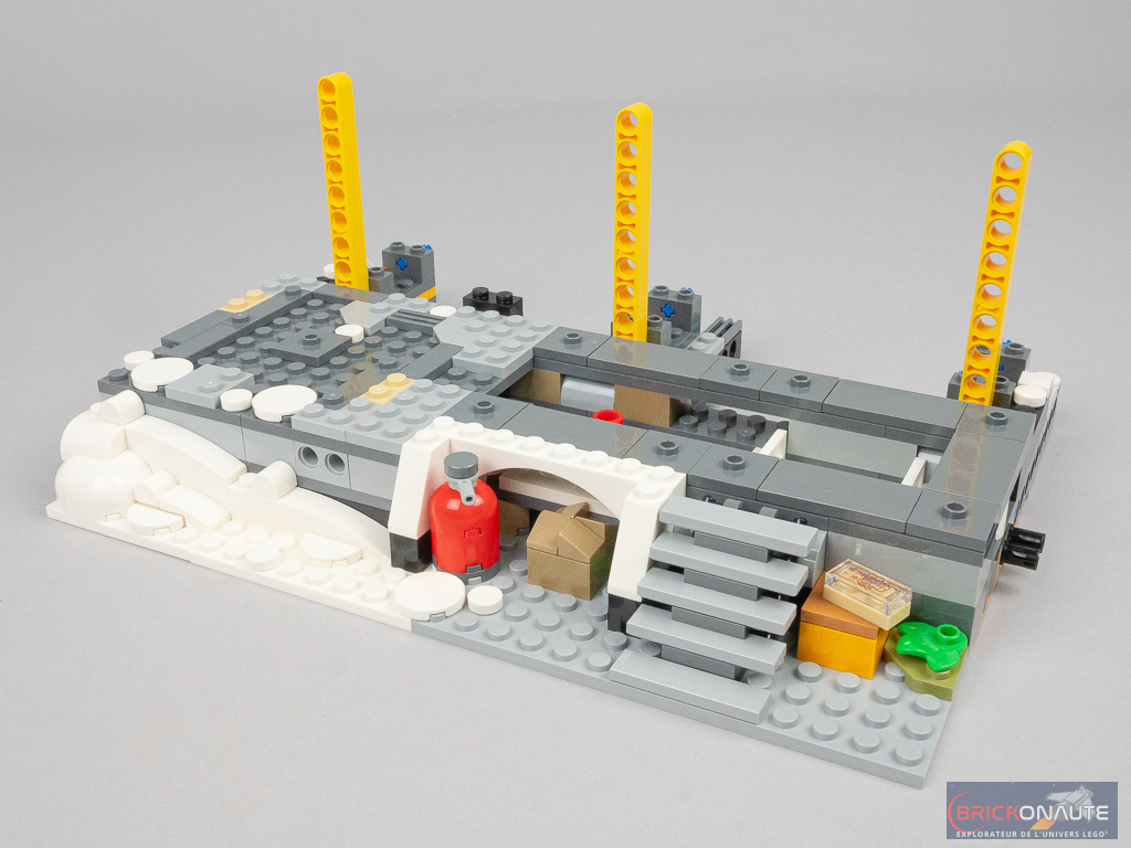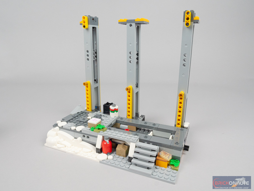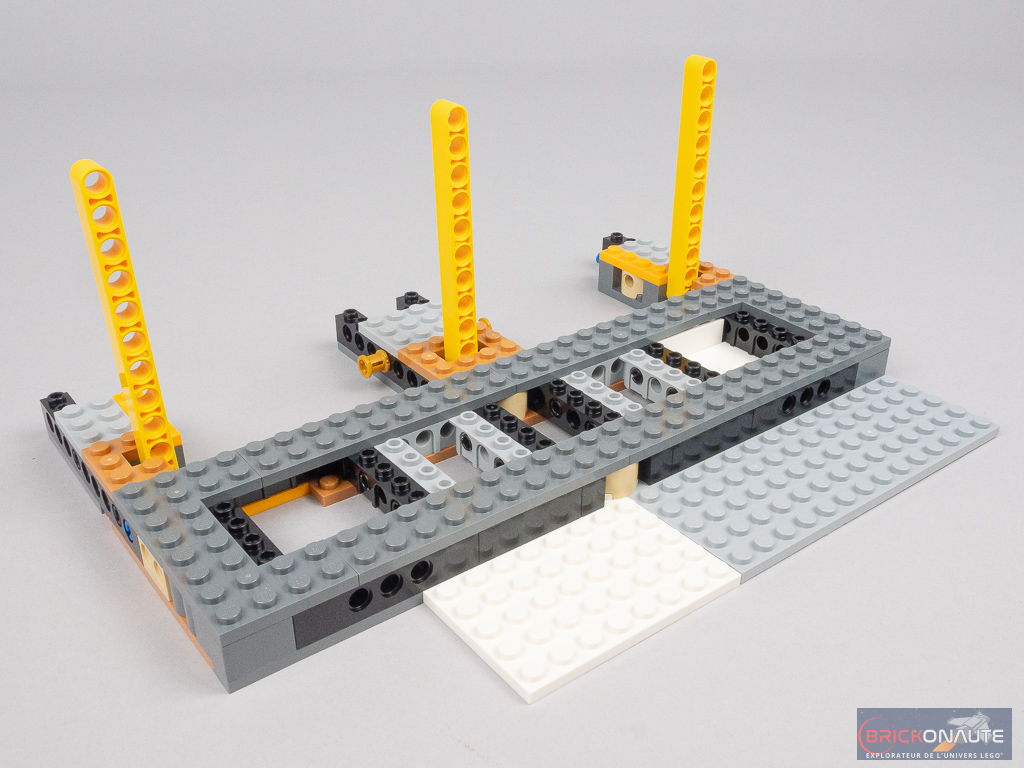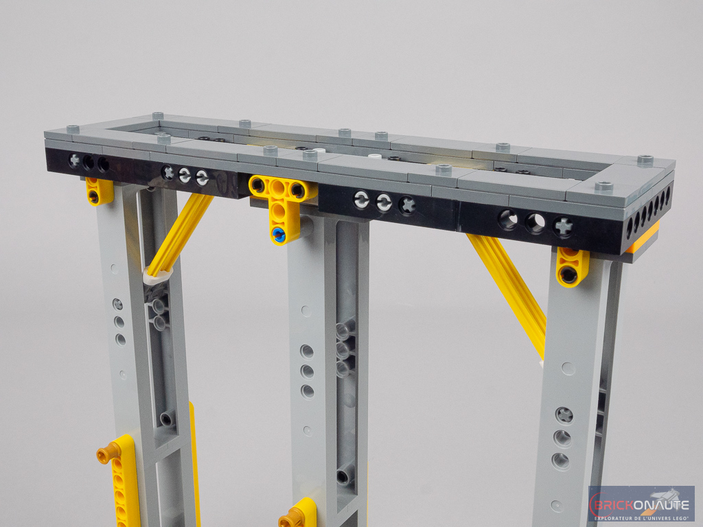 Des grands panneaux gris sont disposés à l’arrière de la construction, et sont solidarisés à l’aide de beams Technic. Ils servent à la fixation de la plateforme supérieure. On assemble ensuite cette plateforme (de 8×24 tenons) puis on l’attache à la structure. Deux renforts obliques à base d’axes Technic terminent la construction de ce support principal.