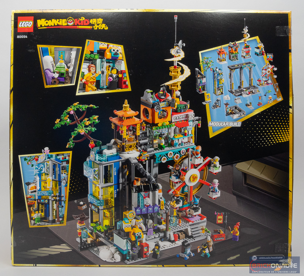 La boîte est particulièrement imposante pour un set vendu « seulement » 179,99 € – en comparaison avec d’autres gammes sous licence, notamment. Sur la face avant, les différents personnages vaquent à leurs occupations dans cette « ville » au look un peu particulier. On y trouve aussi le logo du 5ème anniversaire de la gamme LEGO Monkie Kid, et la ribambelle de personnages que le set contient nous est présentée en partie basse. Au dos, on peu observer la ville sous un autre angle ainsi que quelques vignettes de détail. Une vue éclatée de l’ensemble nous montre également la conception « modulaire » de l’ensemble.