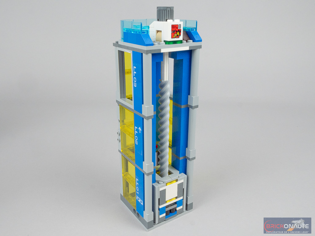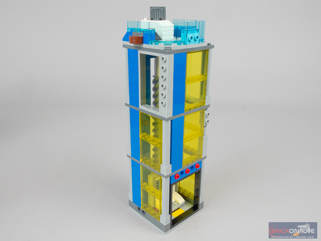 Les structures sont maintenant terminées, la deuxième notice sera consacrée exclusivement à la construction des modules pour habiller la plus grande. Et on commence par le plus grands de ces modules, l’ascenseur. Sa conception s’étend sur 3 niveaux, très similaires. À l’intérieur, on installe une vis sans fin et un petit « plateau » sur lequel installer la minifig qui décide de se rendre aux niveaux supérieurs. Une molette en partie haute permet de le mettre en mouvement, tandis qu’il coulisse sur les briques latérales. La construction de cet ascenseur s’achève par un bel arbre en partie supérieure – remarquez ici les nouvelles pièces roses qui font office de fruits.