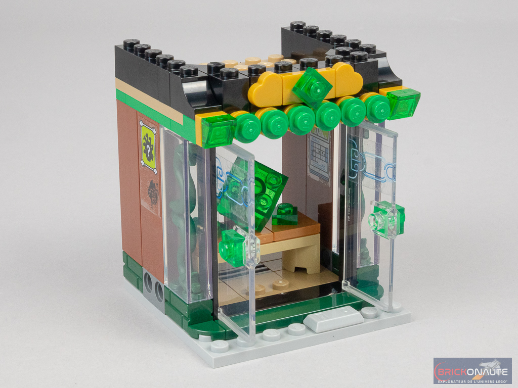 J’avoue ne pas avoir bien compris ce que vendait la boutique du module suivant – on y installe simplement quelques éléments verts translucides dont une brique de 2×2 fixée sur un support de minifig. J’aime par contre particulièrement les deux parois vitrées, qui renferment chacune deux serpents en vis-à-vis – une technique de « remplissage » déjà vue par exemple dans le set 70620 Ninjago City, même s’il s’agissait là de les remplir avec des petites round tiles. Les portes vitrées sont décorées de deux autocollants, pas spécialement faciles à aligner correctement.