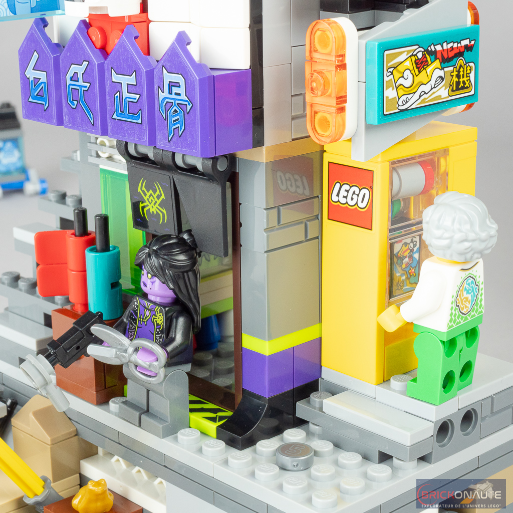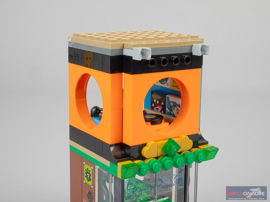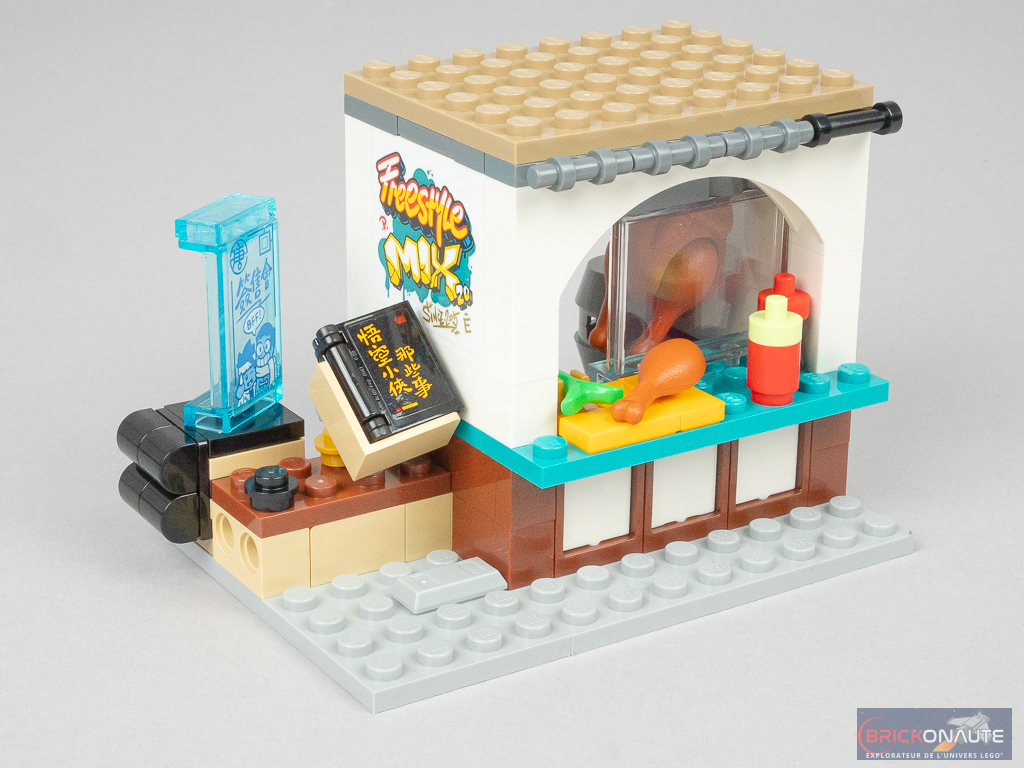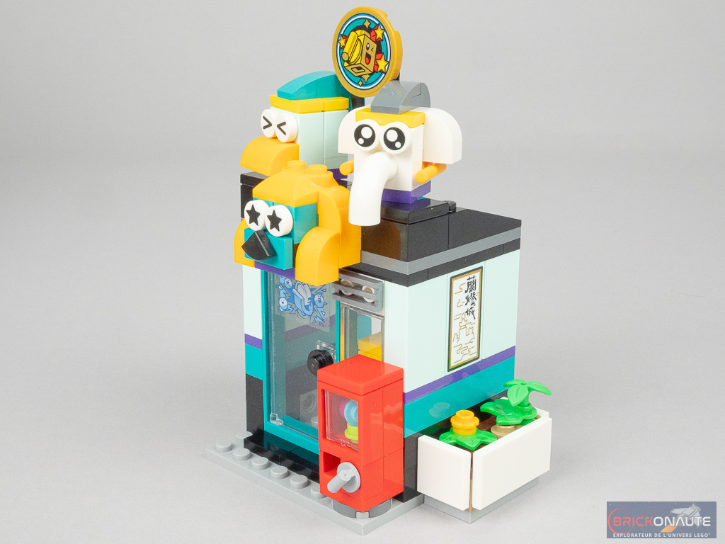 La boutique suivante renferme des machines de style Gacha Pon – où on insère une pièce pour obtenir une babiole enfermée dans une capsule en plastique. Deux machines sont à l’intérieur, la troisième se situe sur le trottoir. Au-dessus, on construit en guise d’enseigne les têtes de quelques personnages de l’univers Monkie Kid (le Yellow Tusk Elephant, le Golden Winged Eagle et l’Azure Lion). Une petite jardinière vient se fixer sur le côté à l’aide de pins Technic. Et c’est ainsi que se termine le niveau inférieur.