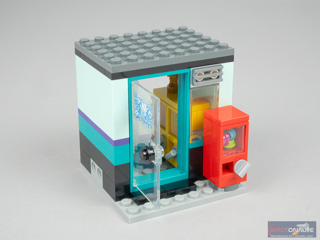 Le module suivant est un peu « méta » – il s’agit d’un distributeur automatique de LEGO comme on peut en trouver dans certains aéroports. On devine même un set LEGO Monkie Kid à l’intérieur. On vient le poser à côté du couturier. Au-dessus, on fixe une enseigne en forme de chaussure, dont on se demande ce qu’elle vient faire là.