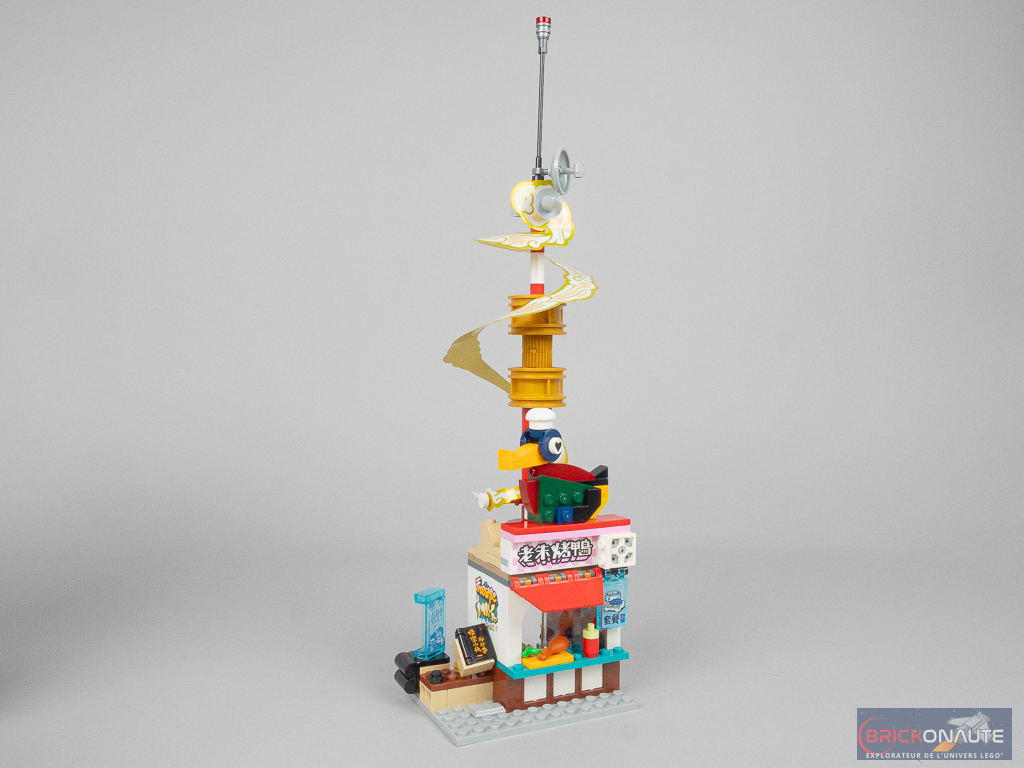 Pour le niveau supérieur, on commence par un petit module avec un support et un livre noir (désolé, je n’ai pas la référence – n’hésitez pas à m’éclairer !), puis une sorte de fast-food qui vend de la volaille, on peut voir les sauces sur le comptoir. La partie inférieure est réalisée avec des vitre blanches insérées dans des cadres. Au-dessus, les trois éléments du store restent bien alignés grâce à des pièces clipsées en dessous. On ajoute l’enseigne et un climatiseur, puis un canard qu’on imagine être une référence au célèbre canard LEGO en bois, fabriqué et commercialisé dans les années 30 par le fondateur du groupe LEGO, Ole Kirk Christiansen. On habille ensuite un grand axe Technic de pièces rouges et dorées, avant d’y fixer une grande pièce souple dorée avec quelques nuages qui vient en faire le tour. On termine avec l’antenne, qui fait culminer notre set à 57cm de haut.