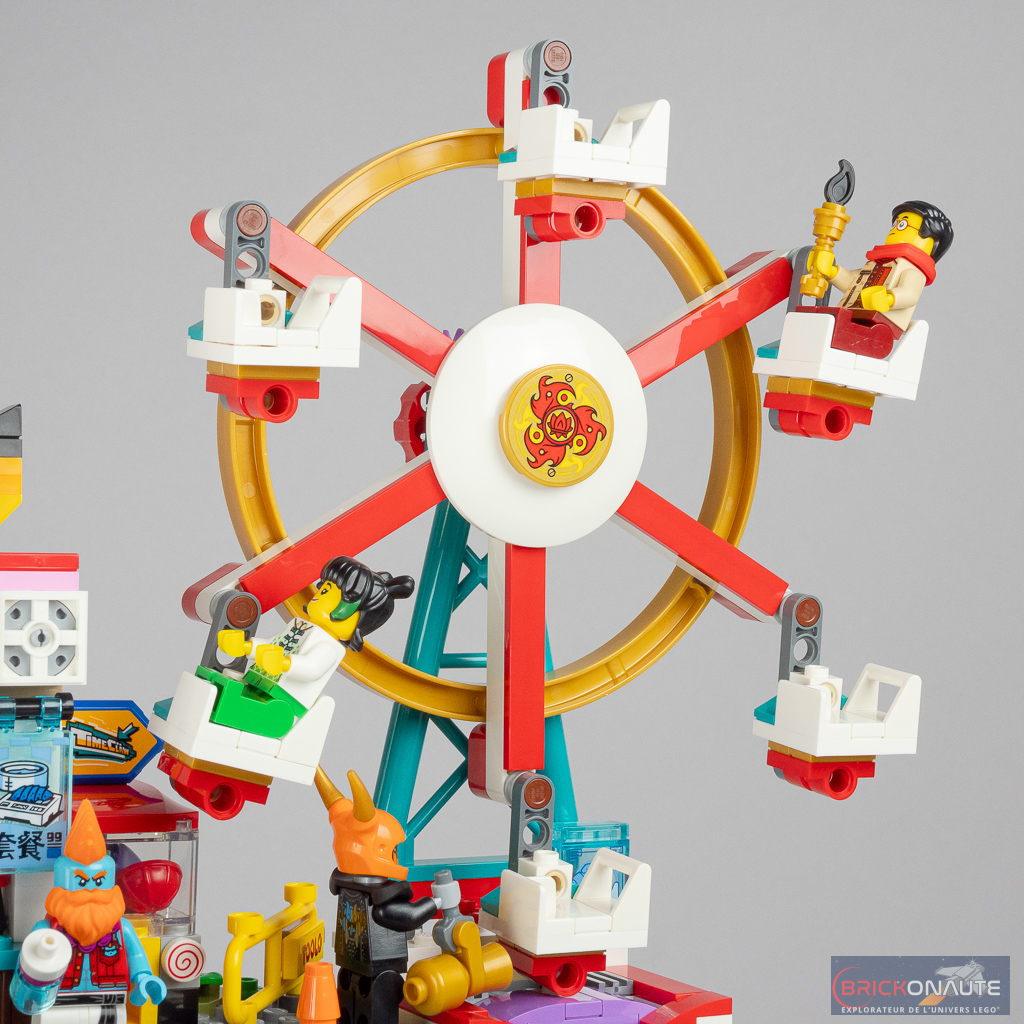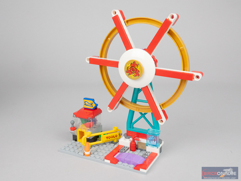 Le dernier module est basé sur une plate de 8×16 tenons. On y installe la base de la structure de la grande roue, et une machine à pinces permettant ici de gagner différents couvre-chefs. On installe la structure principale de la grande roue (une grande pièce dark turquoise de forme triangulaire) puis on s’attaque à la grande roue elle-même. Sa conception est intéressante : sur un grand cercle doré, on vient fixer des beams Technic que l’on rassemble au centre avec des disques à 6 trous (habituellement utilisés pour entraîner des courroies). Il ne reste qu’à construire les 6 nacelles monoplaces, identiques, et à les fixer avec un axe Technic à la structure.