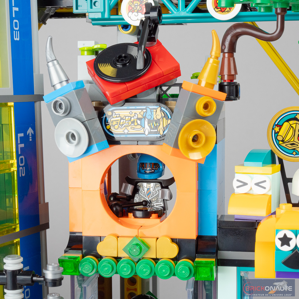 Au niveau supérieure, on installe la loge du DJ avec deux platines vinyles et plusieurs disques rangés dans un bac ou fixés au mur. Petite variation ici dans la réalisation des murs, avec deux ouvertures circulaires oranges, c’est simple mais réussi. Deux enceintes sont fixées sur des ball joints, et l’enseigne en forme de platine géante est installée sur une charnière. On termine ce module avec un petit arbuste.