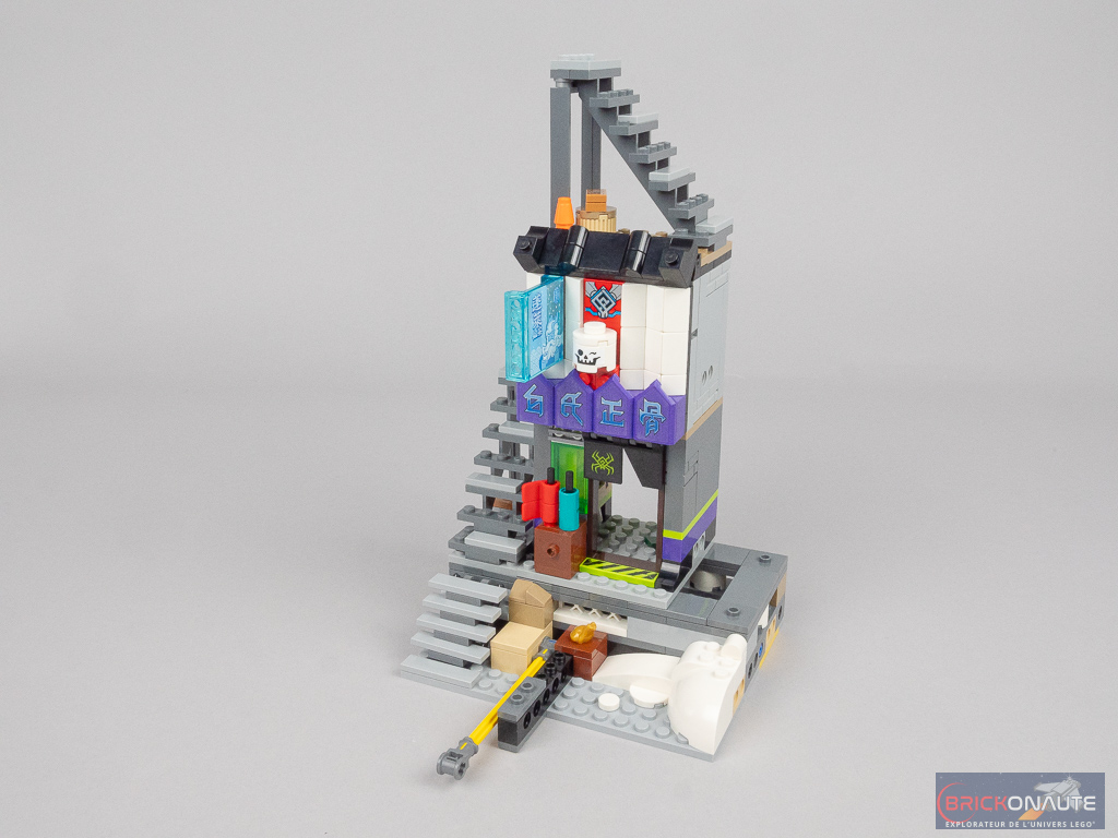 La première remarque qui vient à l’esprit une fois la construction terminée est la suivante : c’est coloré ! Peut-être un peu trop trouveront certains, personnellement je trouve que ce mélange de couleurs correspond plutôt bien à l’univers LEGO Monkie Kid. Si c’est varié dans les couleurs, ça l’est aussi dans les formes. Foncièrement, l’architecture des différents modules est radicalement différente et contribue à cet aspect presque « organique »… pour ne pas dire un peu bordélique. On pourra même réorganiser l’ensemble comme on veut, histoire de mettre encore un peu plus le bazar.