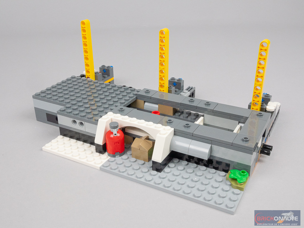 Des grands panneaux gris sont disposés à l’arrière de la construction, et sont solidarisés à l’aide de beams Technic. Ils servent à la fixation de la plateforme supérieure. On assemble ensuite cette plateforme (de 8×24 tenons) puis on l’attache à la structure. Deux renforts obliques à base d’axes Technic terminent la construction de ce support principal.