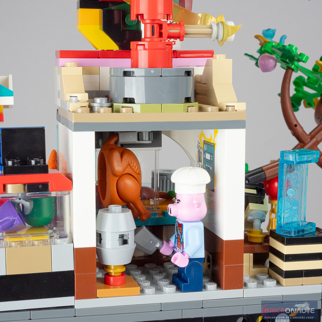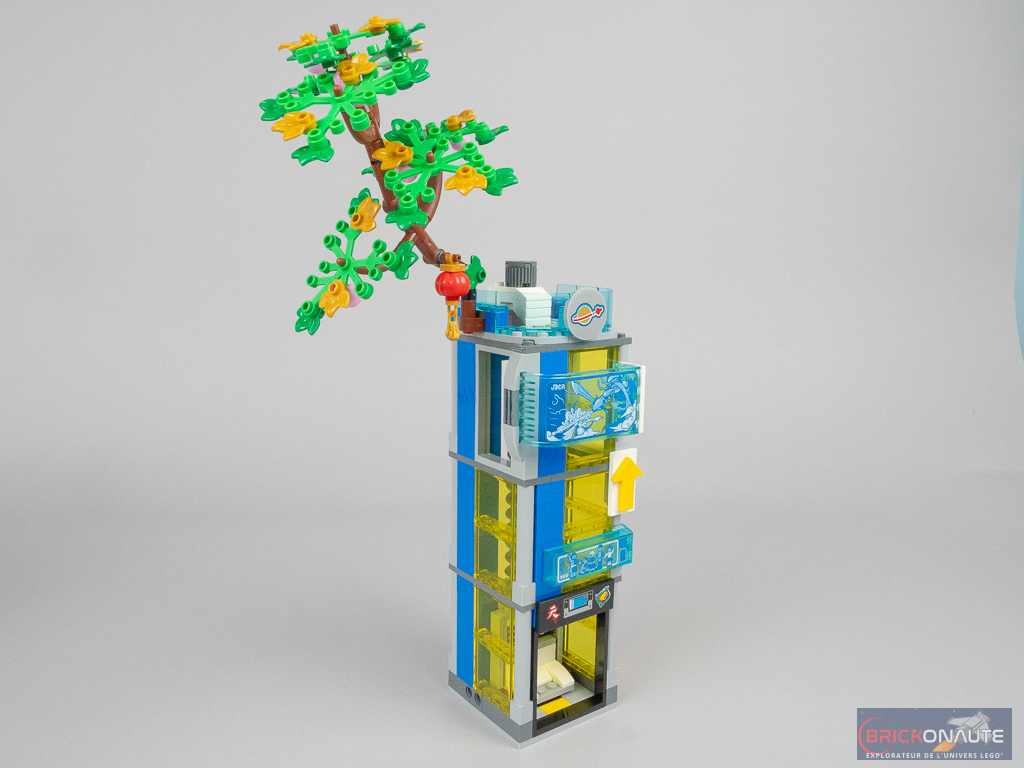 Pour le niveau supérieur, on commence par un petit module avec un support et un livre noir (désolé, je n’ai pas la référence – n’hésitez pas à m’éclairer !), puis une sorte de fast-food qui vend de la volaille, on peut voir les sauces sur le comptoir. La partie inférieure est réalisée avec des vitre blanches insérées dans des cadres. Au-dessus, les trois éléments du store restent bien alignés grâce à des pièces clipsées en dessous. On ajoute l’enseigne et un climatiseur, puis un canard qu’on imagine être une référence au célèbre canard LEGO en bois, fabriqué et commercialisé dans les années 30 par le fondateur du groupe LEGO, Ole Kirk Christiansen. On habille ensuite un grand axe Technic de pièces rouges et dorées, avant d’y fixer une grande pièce souple dorée avec quelques nuages qui vient en faire le tour. On termine avec l’antenne, qui fait culminer notre set à 57cm de haut.