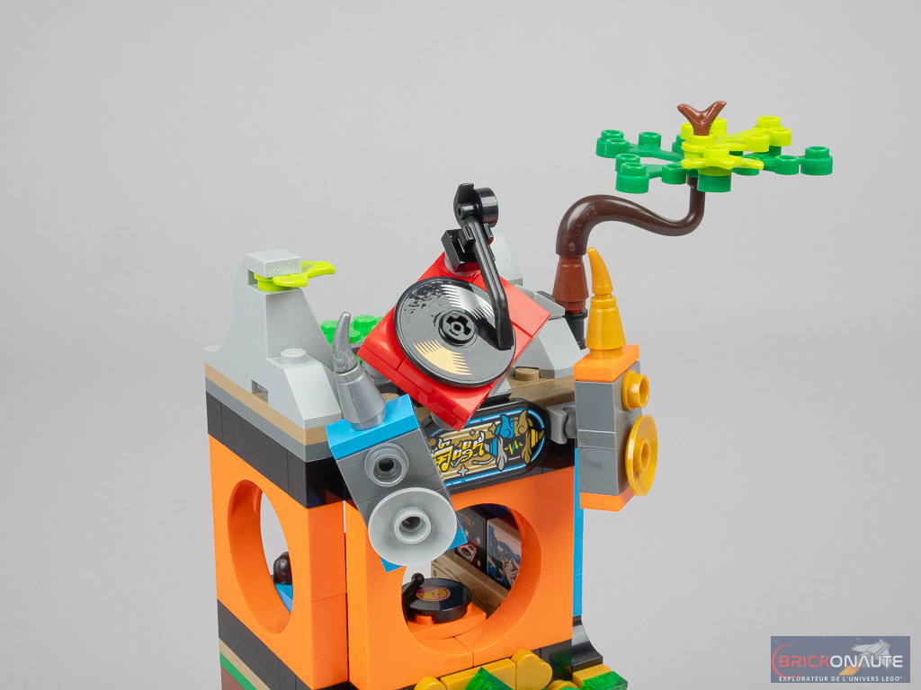 La première remarque qui vient à l’esprit une fois la construction terminée est la suivante : c’est coloré ! Peut-être un peu trop trouveront certains, personnellement je trouve que ce mélange de couleurs correspond plutôt bien à l’univers LEGO Monkie Kid. Si c’est varié dans les couleurs, ça l’est aussi dans les formes. Foncièrement, l’architecture des différents modules est radicalement différente et contribue à cet aspect presque « organique »… pour ne pas dire un peu bordélique. On pourra même réorganiser l’ensemble comme on veut, histoire de mettre encore un peu plus le bazar.