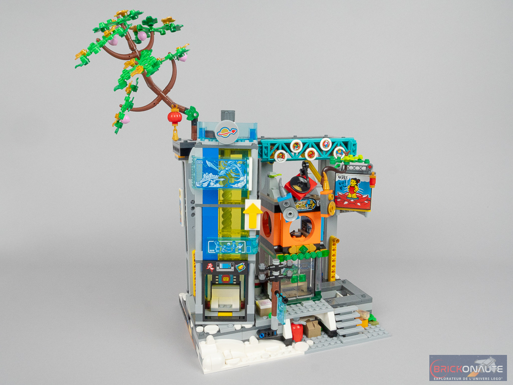 La boutique suivante renferme des machines de style Gacha Pon – où on insère une pièce pour obtenir une babiole enfermée dans une capsule en plastique. Deux machines sont à l’intérieur, la troisième se situe sur le trottoir. Au-dessus, on construit en guise d’enseigne les têtes de quelques personnages de l’univers Monkie Kid (le Yellow Tusk Elephant, le Golden Winged Eagle et l’Azure Lion). Une petite jardinière vient se fixer sur le côté à l’aide de pins Technic. Et c’est ainsi que se termine le niveau inférieur.