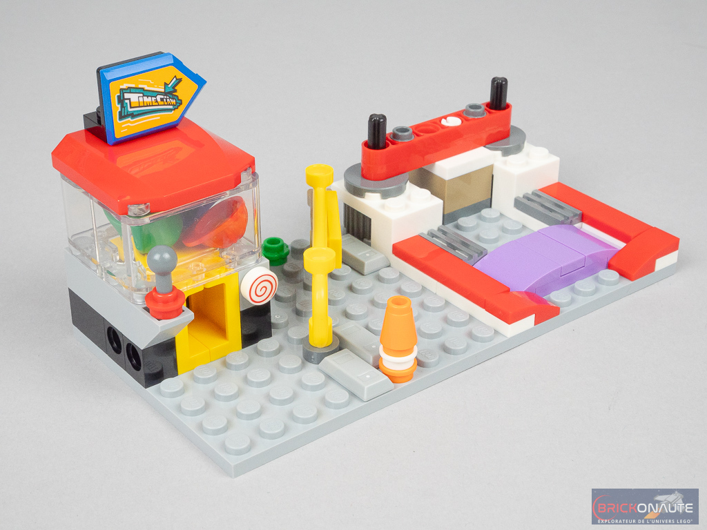 Le module suivant est un peu « méta » – il s’agit d’un distributeur automatique de LEGO comme on peut en trouver dans certains aéroports. On devine même un set LEGO Monkie Kid à l’intérieur. On vient le poser à côté du couturier. Au-dessus, on fixe une enseigne en forme de chaussure, dont on se demande ce qu’elle vient faire là.