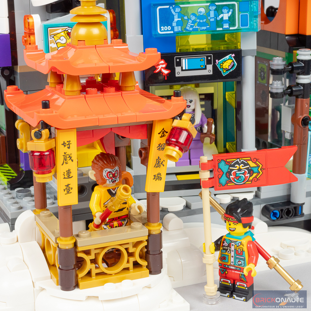 Autre point fort, cette conception permettra de combiner ce set avec d’autres boîtes LEGO Monkie Kid pour créer une ville de plus grande ampleur. Plus précisément avec les références 80036 The City of Lanterns (2187 pièces – 139,99 €) et 80044 Monkie Kid’s Team Hideout (1582 pièces – 99,99 €) – ça demandera un sacré budget, mais la construction sera alors particulièrement impressionnante.