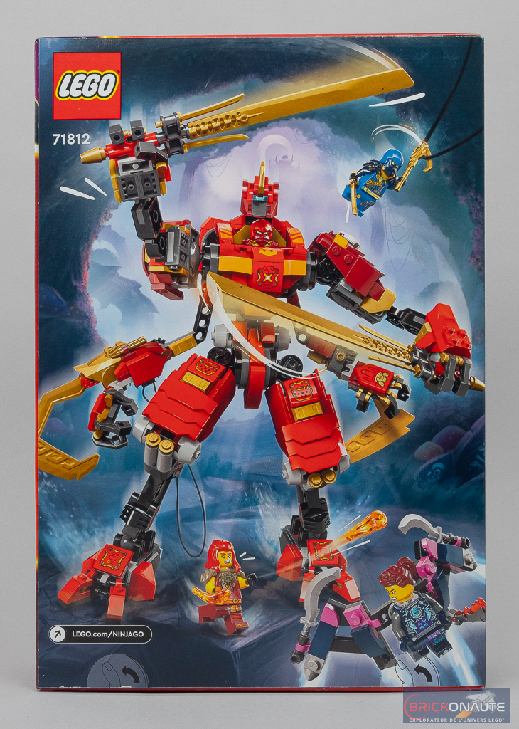 Malgré un inventaire finalement assez réduit (623 pièces), la boîte est plutôt imposante. Au format portrait elle nous propose sur sa face avant le robot en action avec Kai aux commandes, tandis que les 3 autres personnages virevoltent autour. Une autre mise en scène nous est proposée au dos dans ce qui semble être l’intérieur d’une grotte.