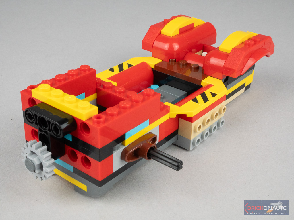 On retourne la machine pour construire les axes des roues arrières, puis on fait un peu de déco sur l’arrière – et c’est plutôt réussi. On termine le châssis avec le capot, les échappements, les phares et le « réacteur » arrière. La partie arrière de la foreuse intègre un engrenage, qui relié au châssis permet aux deux éléments de la foreuse de tourner en sens inverse. Il ne reste qu’à ajouter les 4 roues et notre foreuse est terminée.