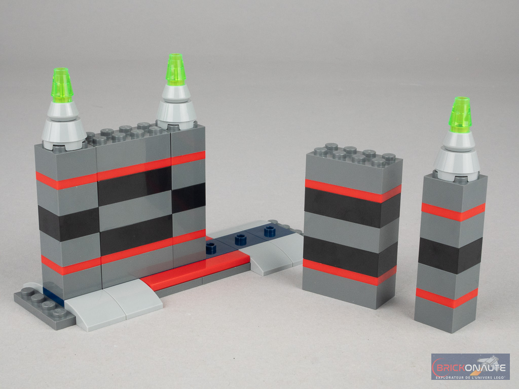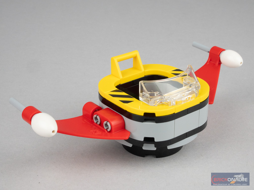 La dernière construction est un petit aéroglisseur dont les ailes sont formées de panels Technic inversés, au bout desquels on ajoute deux flick fire missiles – ces petits projectiles à éjecter d’une simple pichenette. On attache cet aéroglisseur dans l’emplacement prévu de la foreuse, et la construction est terminée.