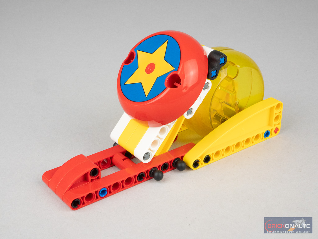 On commence la construction par le lanceur de la « boule de vitesse », il s’agit ici d’un assemblage de 3 sous-ensembles Technic, l’ensemble central fixé sur deux pins permettant d’éjecter la boule (qui n’en est pas vraiment une) en tapant sur le gros bumper tampographié.