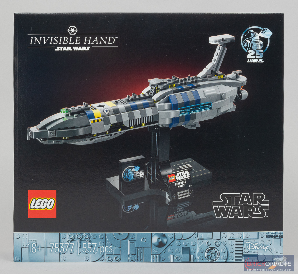 Comme les autres vaisseaux de la Starship Collection, l’Invisible Hand nous est présenté sur un fond noir sur l’avant de la boîte, une bande colorée reprenant la mention « 18+ », la référence du set et son nombre de pièces. On trouve également le logo célébrant les 25 ans de la gamme LEGO Star Wars dans le coin supérieur droit. Au dos, le vaisseau nous est présenté sous un autre angle, un schéma précise ses dimensions : 30cm de long pour 10cm de haut, socle inclus. Une petite vignette nous propose également une image du film.