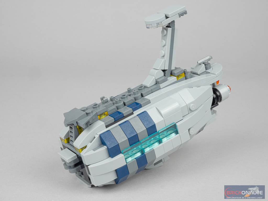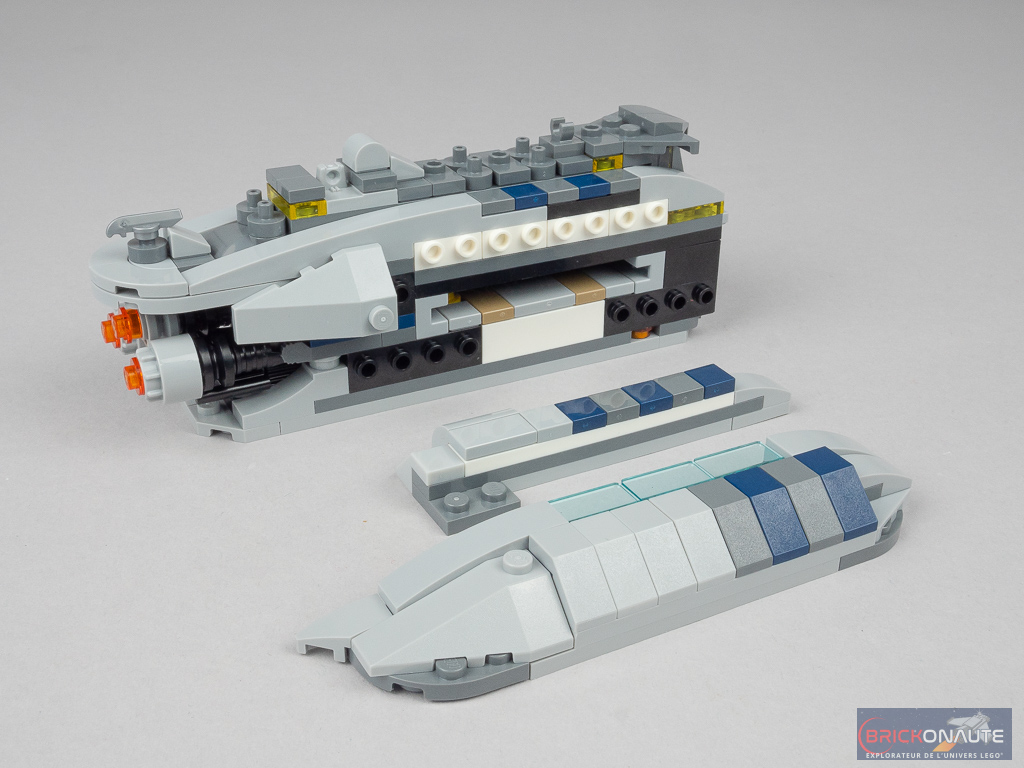 L’expérience de construction est digne de ce qu’on attend de ce type de sets, avec ce qu’il faut de « techniques » de construction. Petit détail qui a son importance, tout comme dans le film où le vaisseau termine en deux morceaux (pour que seule la partie avant « atterrisse » en catastrophe sur Coruscant), il est ici possible de le séparer en deux, les deux moitiés étant attachées ensemble par des clips. Et malgré cette solution, l’ensemble reste plutôt robuste – entendez par là que le nez ne risque pas de tomber sous son propre poids malgré les manipulations.