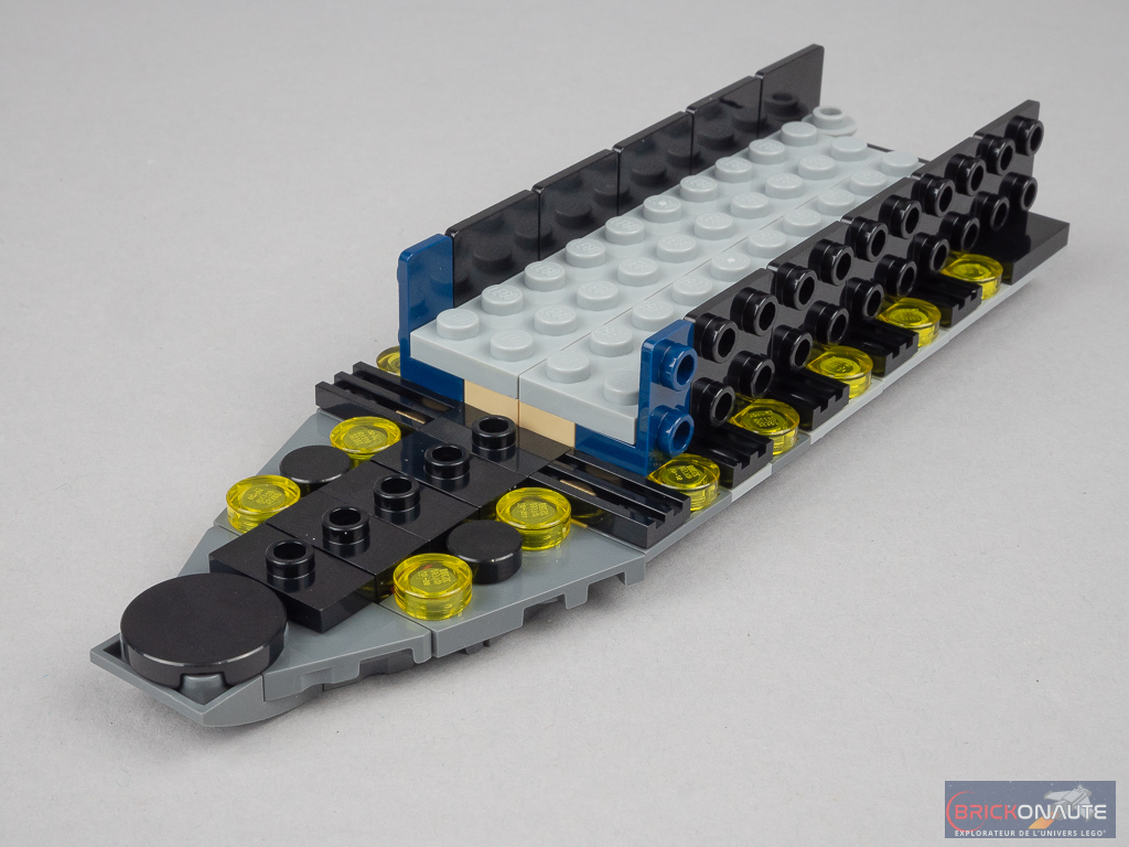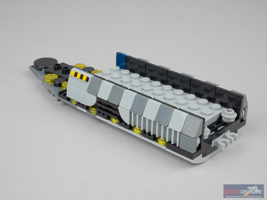 Jusqu’ici, nous nous étions occupés de l’arrière du vaisseau, on passe logiquement sur l’avant avec un grand sous-ensemble ponctué de round tiles translucides en partie basse qui apportent un niveau de détail très satisfaisant. Au-dessus, plusieurs brackets permettent la fixation des éléments de la carlingue. Remarquez également les clips à l’arrière qui permettront de rassembler les deux moitiés du vaisseau.
