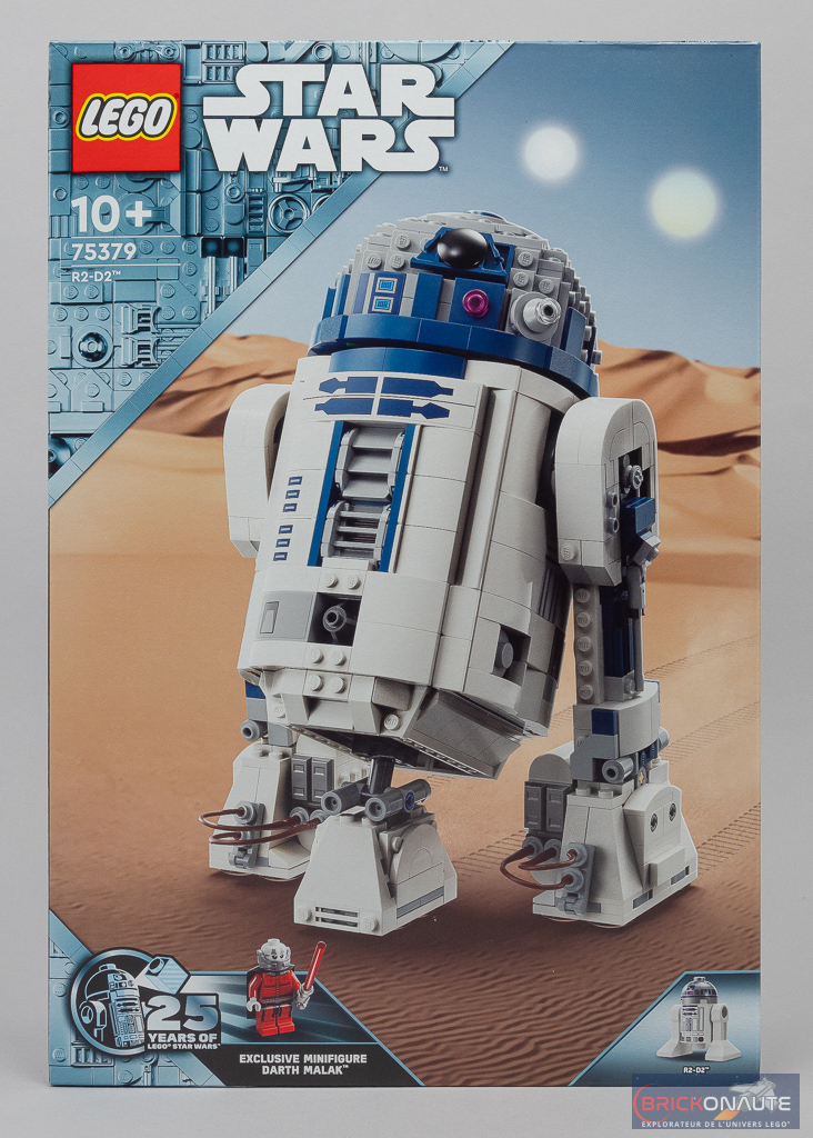La boîte au format portrait arbore les couleurs dédiées aux sets célébrant le 25ème anniversaire de la gamme LEGO Star Wars. R2-D2 semble bien perdu au milieu du désert de Tatooine. Aux côtés du logo du 25ème anniversaire, en bas à gauche, LEGO nous présente la minifig exclusive contenue dans cette boîte : Darth Malak. L’autre minifig n’est autre que R2-D2 et nous est présentée en bas à droite. Au dos de la boîte, R2-D2 est équipé de ses différents outils et accompagné de sa plaque de présentation. Un petit schéma nous montre cette possibilité de personnaliser le robot en lui ajoutant ses outils et/ou en retirant son pied central.