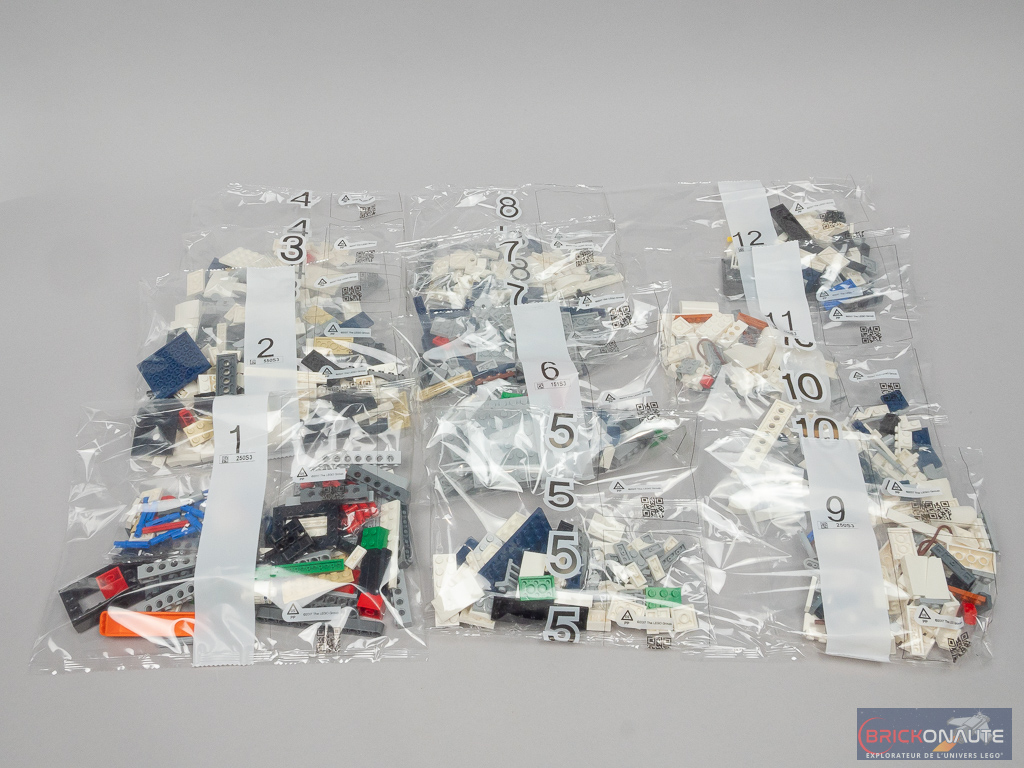 À l’intérieur de la boîte, on trouve 12 sachets en plastique numérotés, une notice d’instructions de 176 pages et une planche de 10 autocollants. Hormis les quelques éléments tampographiés, une lecture rapide de l’inventaire ne m’a pas permis de déceler d’éléments notables.