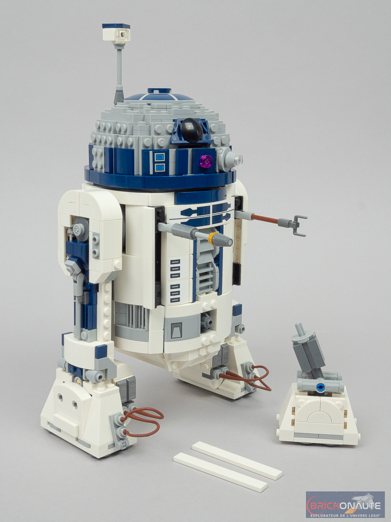 On pourra choisir de l’exposer avec ou sans ses accessoires (périscope, bras à pince et bras d’alimentation), LEGO nous fournit une tile blanche supplémentaire pour couvrir les deux côtés si on le souhaite. Ces éléments ne sont pas escamotables, tout comme le pied central qu’il faudra détacher si on souhaite disposer R2-D2 à la verticale en mode statique.