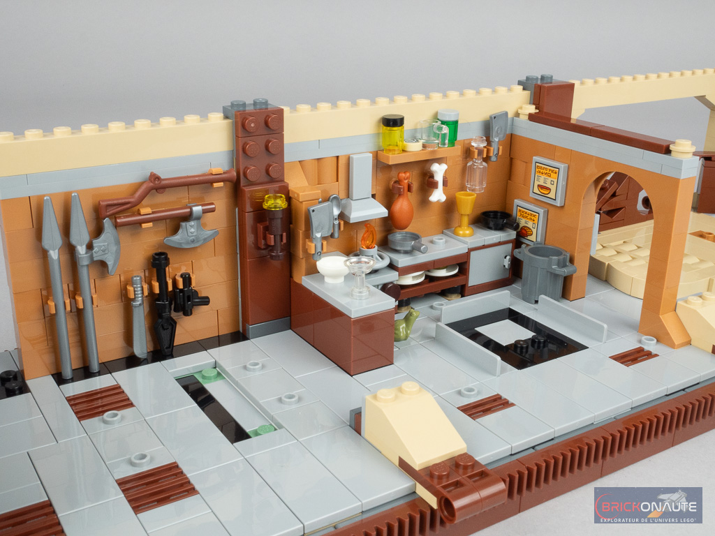 On continue avec l’aménagement intérieur en créant notamment un orgue pour Max Rebo, une plateforme pour Jabba, une cuisine et une salle d’armes avec une petite prison – le tout étant littéralement bourré de détails. Une porte coulissante permet d’accéder au cockpit aménagé avec deux sièges et ses écrans de commande, et deux échelles assurent la liaison avec le pont supérieur. Notez que ces échelles sont amovibles, de sorte à pouvoir facilement mettre en scène les minifigs dans les différentes pièces.