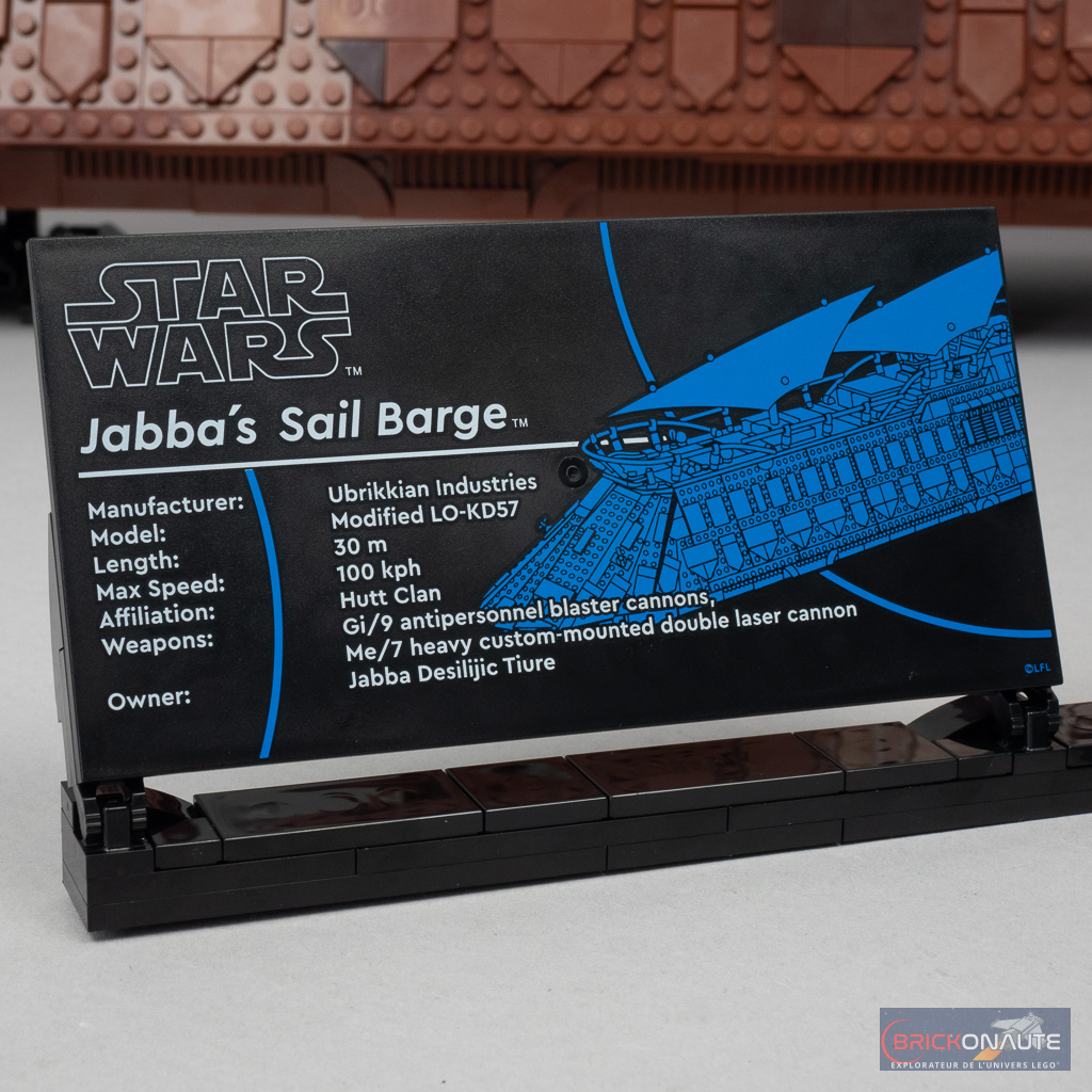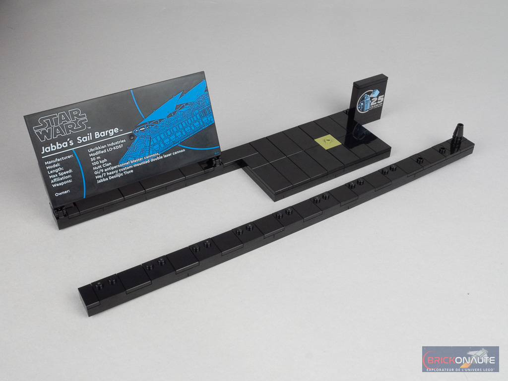À moins que l’on préfère exposer ces dernières sur les supports dédiés – très simples de conception mais qui ont le mérite d’exister. Une plateforme est prévue pour Jabba aux côtés de la tile signalétique habituelle des sets UCS reprenant quelques infos sur le véhicule / vaisseau représenté. Notez que celle-ci est tampographiée, comme c’est maintenant la norme dans la gamme LEGO Star Wars. Un second support, tout en longueur, permet d’exposer les 10 autres personnages.