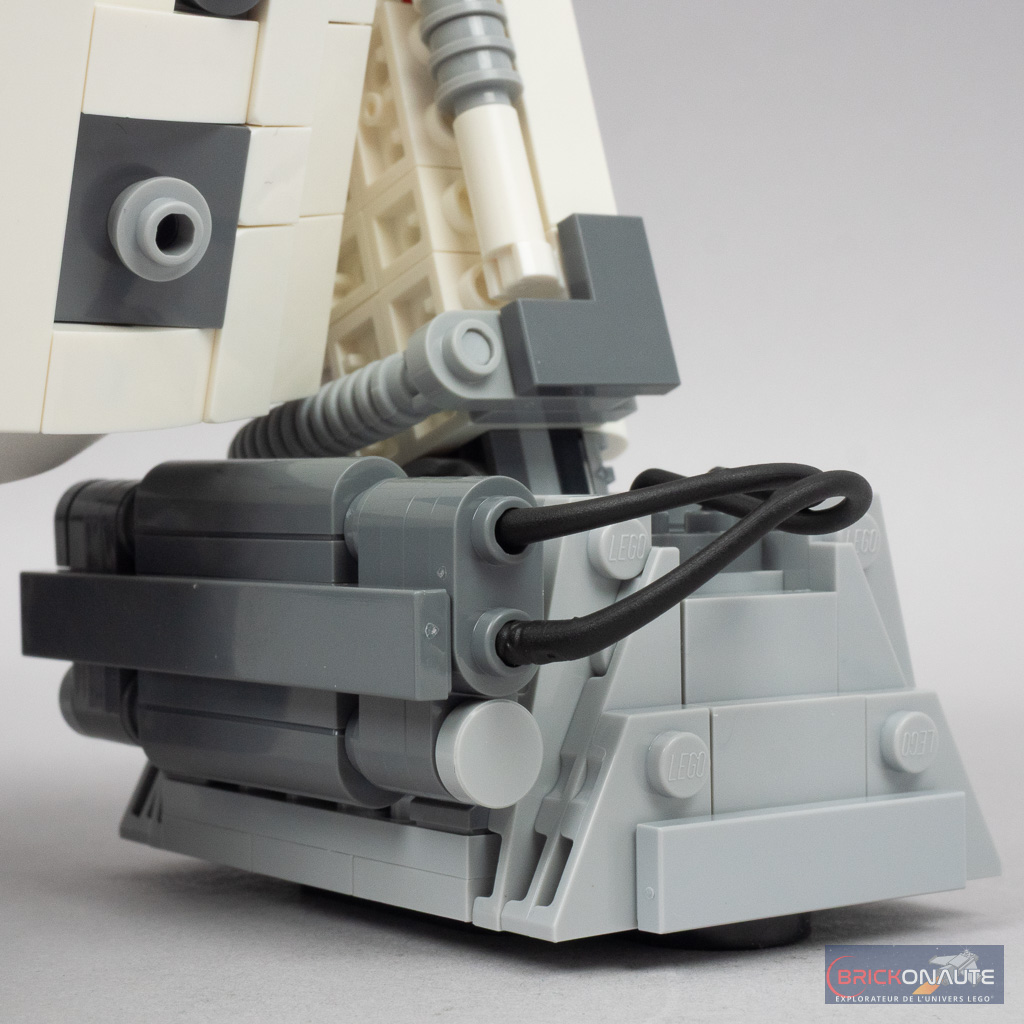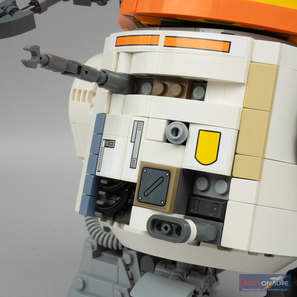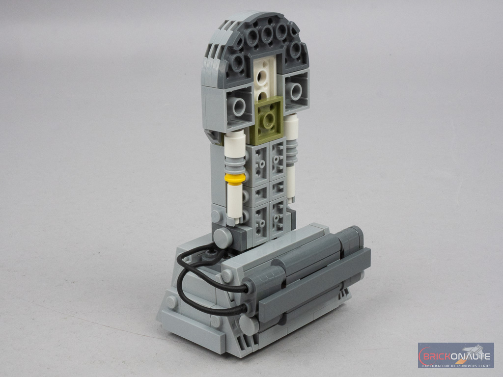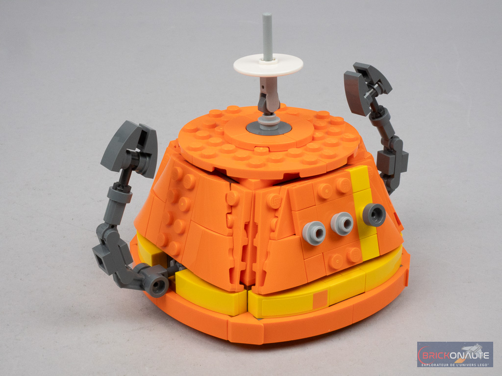 Le niveau de détail est tout à fait satisfaisant, même s’il s’appuie en partie sur quelques autocollants – malheureusement et comme toujours un peu trop « blancs ». L’essentiel reste brick-built – comme les câbles qui dépassent sous une partie manquante de sa coque (habilement reproduits avec deux saucisses noires), ses trois « yeux », ses bras articulés, son antenne… même le petit levier qui lui permet de hocher la tête et placé sur la face arrière du corps est plutôt bien intégré.