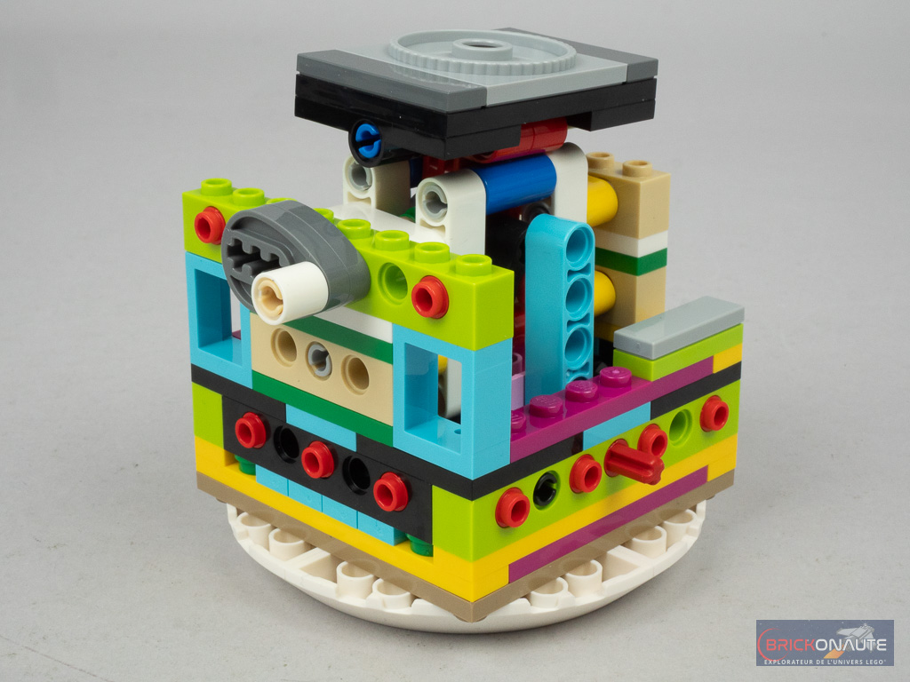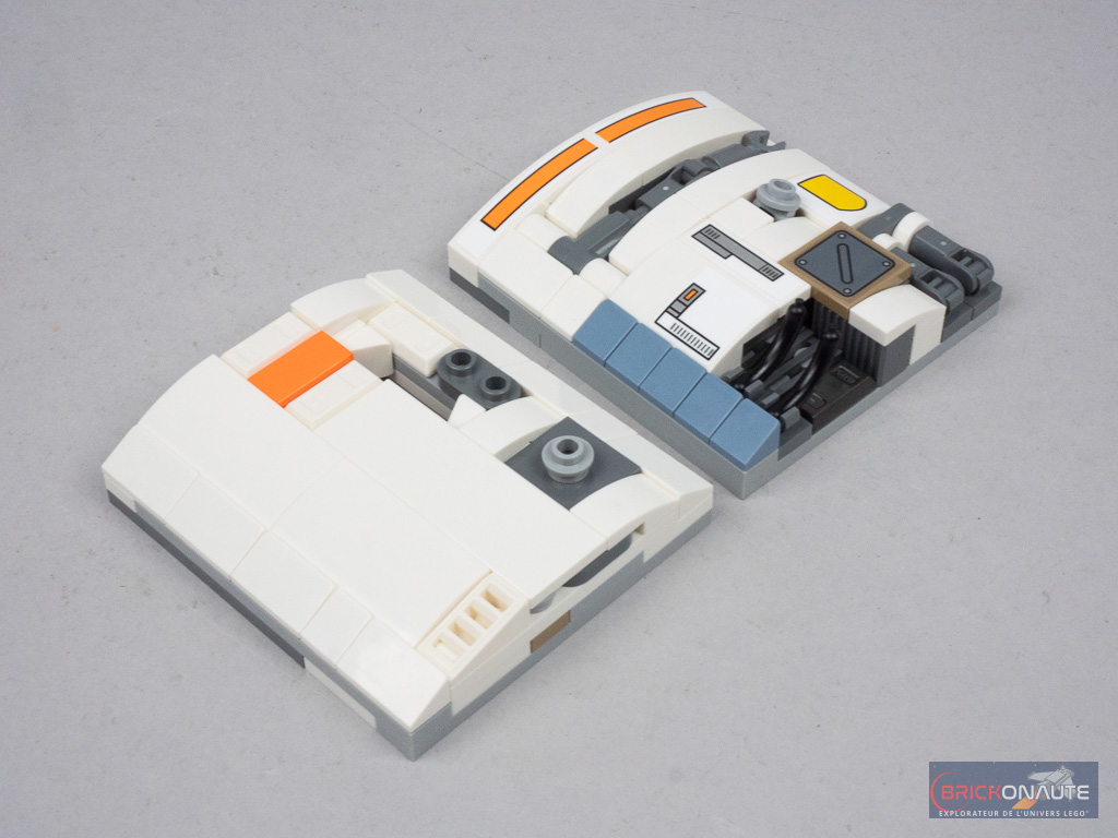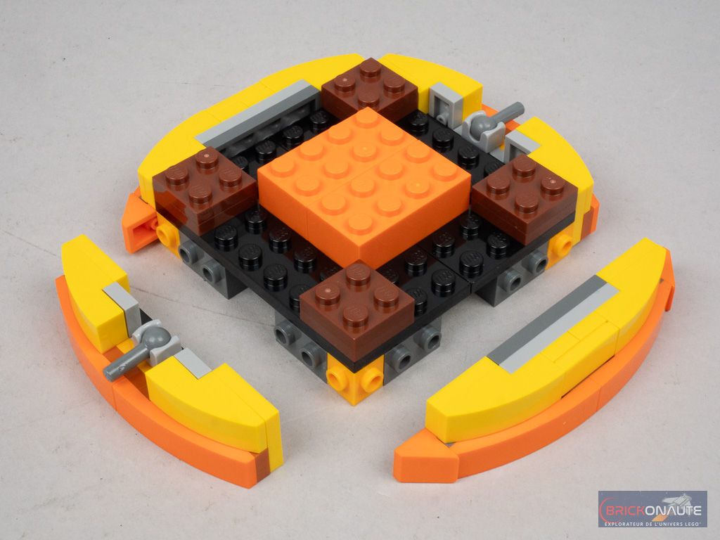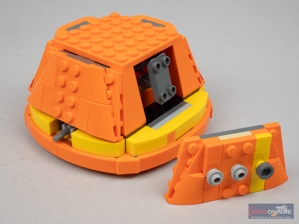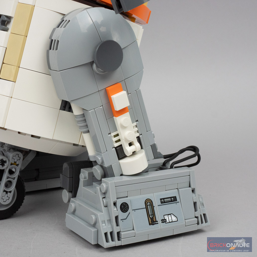 Le niveau de détail est tout à fait satisfaisant, même s’il s’appuie en partie sur quelques autocollants – malheureusement et comme toujours un peu trop « blancs ». L’essentiel reste brick-built – comme les câbles qui dépassent sous une partie manquante de sa coque (habilement reproduits avec deux saucisses noires), ses trois « yeux », ses bras articulés, son antenne… même le petit levier qui lui permet de hocher la tête et placé sur la face arrière du corps est plutôt bien intégré.