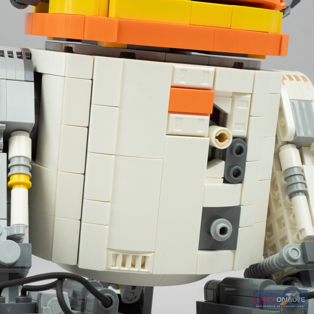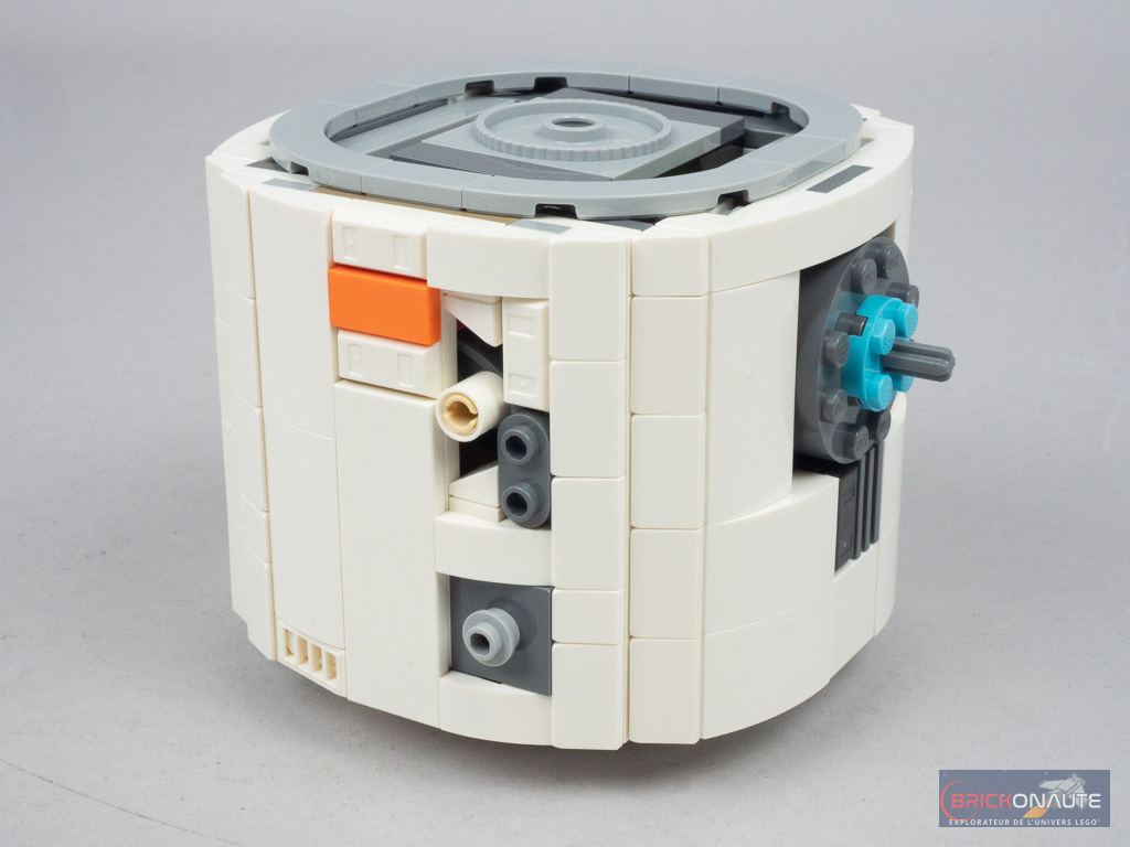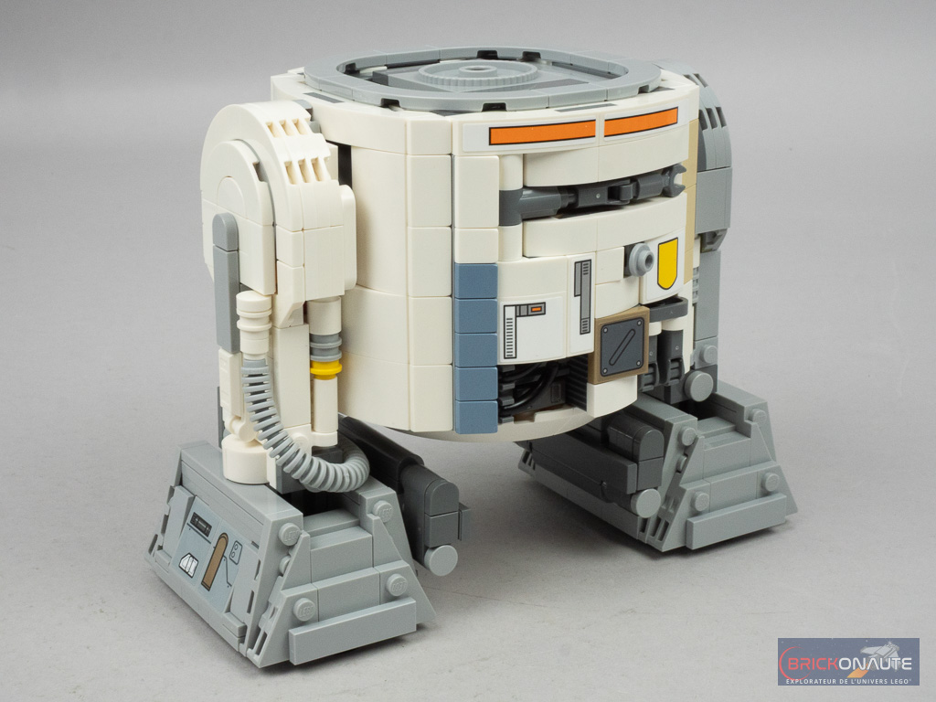 Au niveau des proportions, il est ainsi logiquement un peu plus petit que R2 tout en conservant les caractéristiques d’un droïde astromech, avec ce corps cylindrique, ses deux grandes « jambes » latérales, et sa tête rotative. Une tête à la forme un peu particulière (un cône tronqué), qui aurait cependant mérité d’être un peu plus large que le corps à sa base – et un peu moins haute. Ce genre de forme n’est pas spécialement facile à reproduire en éléments LEGO, surtout à cette échelle, mais je trouve que le designer s’en tire honorablement.