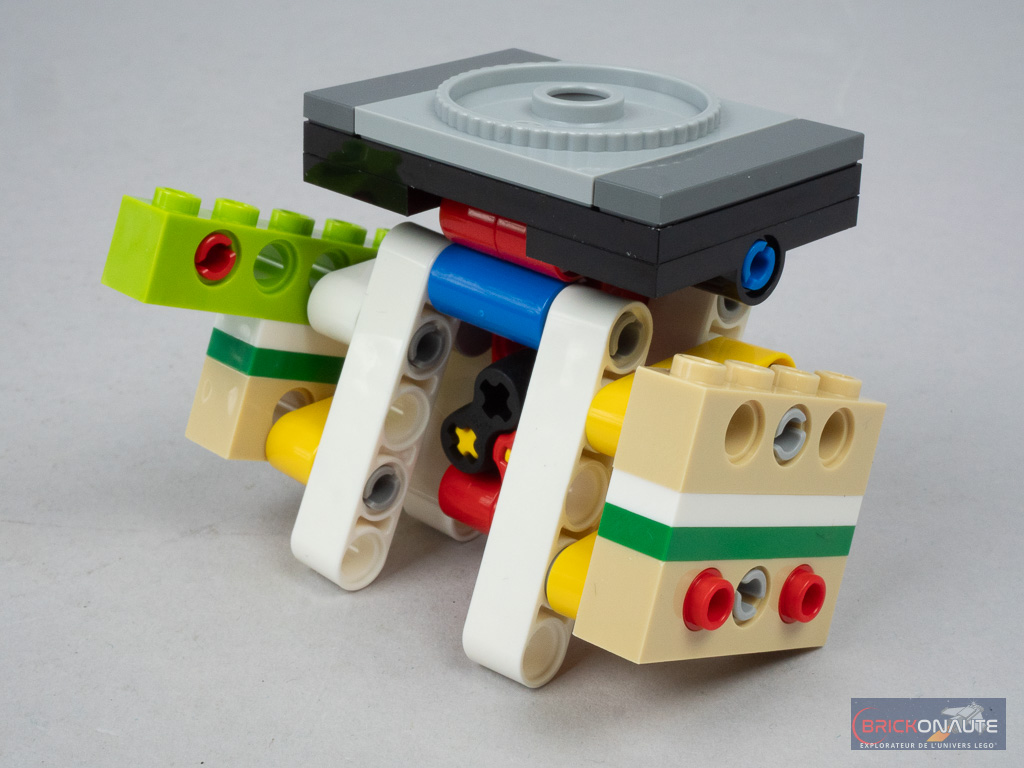 Le processus de construction est logiquement assez similaire, et commence par l’assemblage de la structure interne du droïde qui renferme un petit mécanisme qui lui fera incliner la tête en actionnant un levier situé sur l’arrière du modèle. Un système de turntables et de leviers intérieurs permet également de limiter le débattement des jambes. Une technique de construction intéressante est employée ici pour la partie inférieure du corps, avec des tenons inversés grâce à un système de clips.
