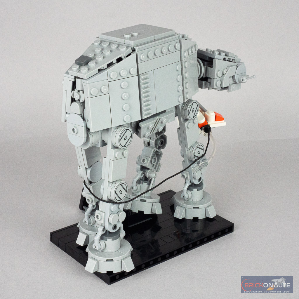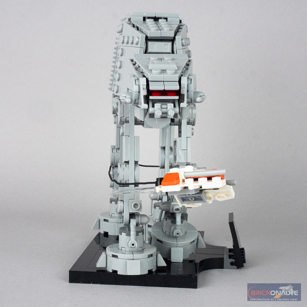 La pose est dynamique et on pourra orienter la tête – seul élément mobile de la construction. Le petit snowspeeder, minimaliste et composé de seulement quelques pièces, semble réellement « flotter » sur sa tige transparente, et le câble qu’il tire rappellera aux fans la célèbre scène de L’Empire Contre-Attaque. Le support noir lisse et la plaque de présentation apportent un petit côté premium.
