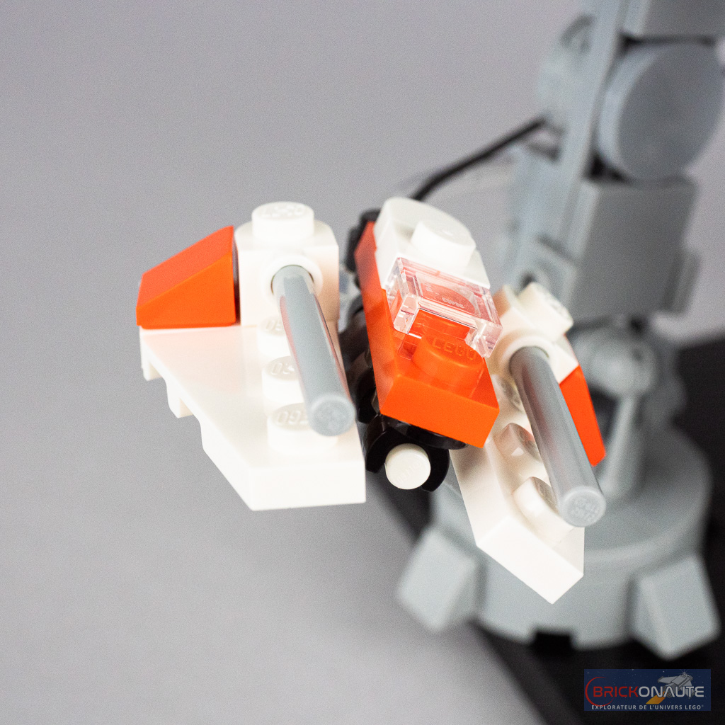 Le niveau de détail me semble également plus que satisfaisant avec un joli travail à tous les niveaux, depuis les articulations des pieds jusqu’à la tête de la machine et son poste de pilotage rouge translucide et ses canons. Seul défaut notable, assez peu visible sur mes photos mais bien plus en vrai : on remarquera des différences de teinte entre certains éléments gris de la carlingue.